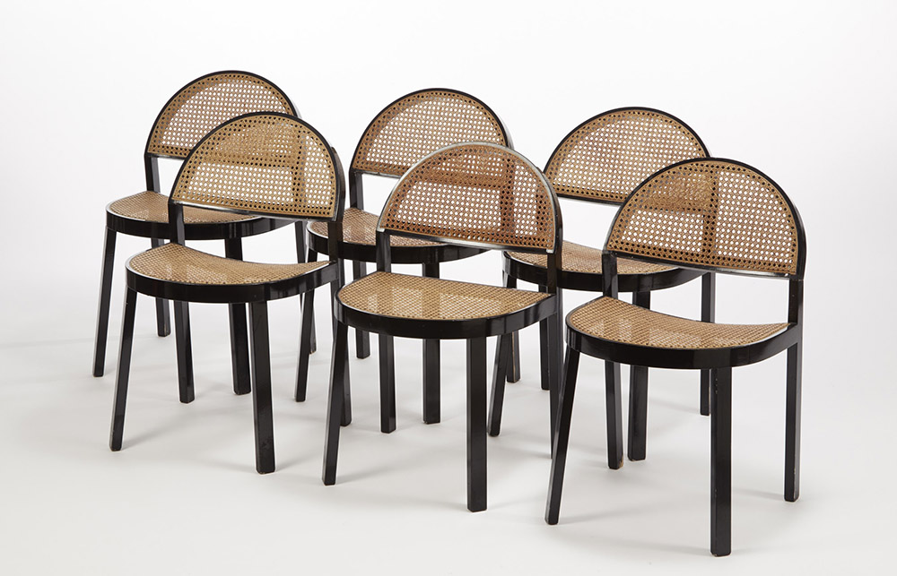 Jonathan De Pas (Milano 1932 - 1991), Donato D'Urbino (Milano 1935), Paolo Lomazzi (Milano 1936) Sei sedie modello "Pluto". Produzione BBB Bonacina, Meda, 1971. Legno laccato nero e canna d'India (cm 47x76x50) (lievi difetti) Bibliografia: R. De Fusco, Made in Italy. Storia del design italiano, Altralinea, Firenze 2014, p. 207 Six chairs model "Pluto". Produced by BBB Bonacina, Meda, 1971. Black lacquered wood and Indian cane (cm 47x76x50) (minor defects)