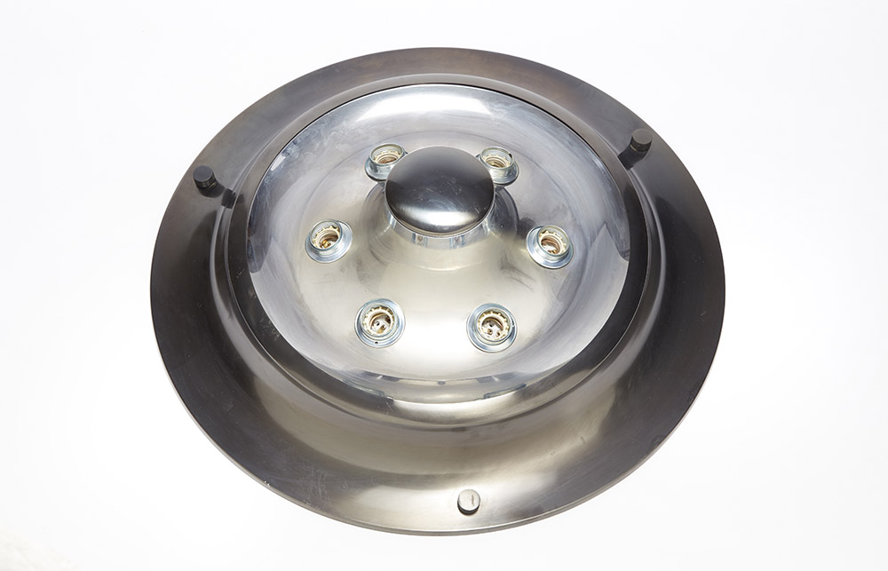 Luigi Caccia Dominioni ( 1913) Lampada da plafone a sei luci in metallo brunito e cromato. Produzione Azucena, Milano, anni 70 (d cm 65,5) (lievi difetti) Six lights ceiling lamp, chromium-plated and burnished metal. Produced by Azucena, Milan, 1970s (d cm 65,5) (minor defects)