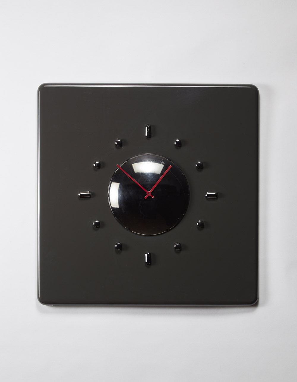 Luigi Caccia Dominioni (1913) (attribuito) Orologio da parete in legno e metallo laccato grigio e nero. Produzione Azucena, Milano, 1975 ca (cm 60x60) (lievi difetti) Wood and metal clock. Produced by Azcena, Milan, circa 1975 (cm 60x60)
