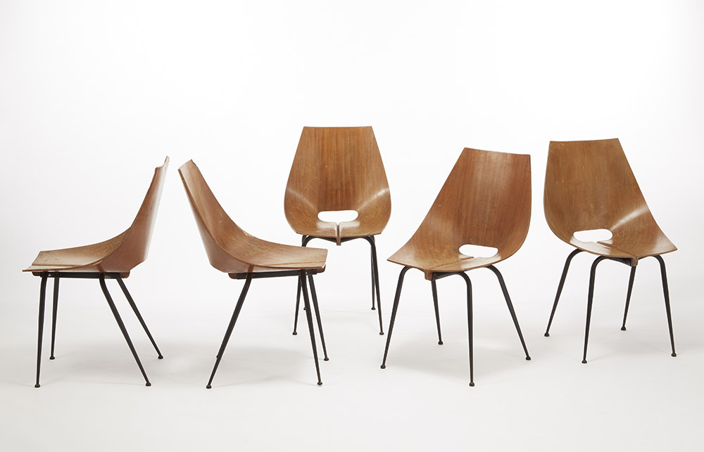 Carlo Ratti (attribuito) Cinque sedie in compensato di teak curvato al vapore, struttura in metallo verniciato nero. Società Compensati Curvati, Italia, anni 50 (cm 47x81x42) (difetti) Five plywood teak chairs, black varnished metal structure. Società Compensati Curvati, Italy, 1950s (cm 47x81x42) (defects)
