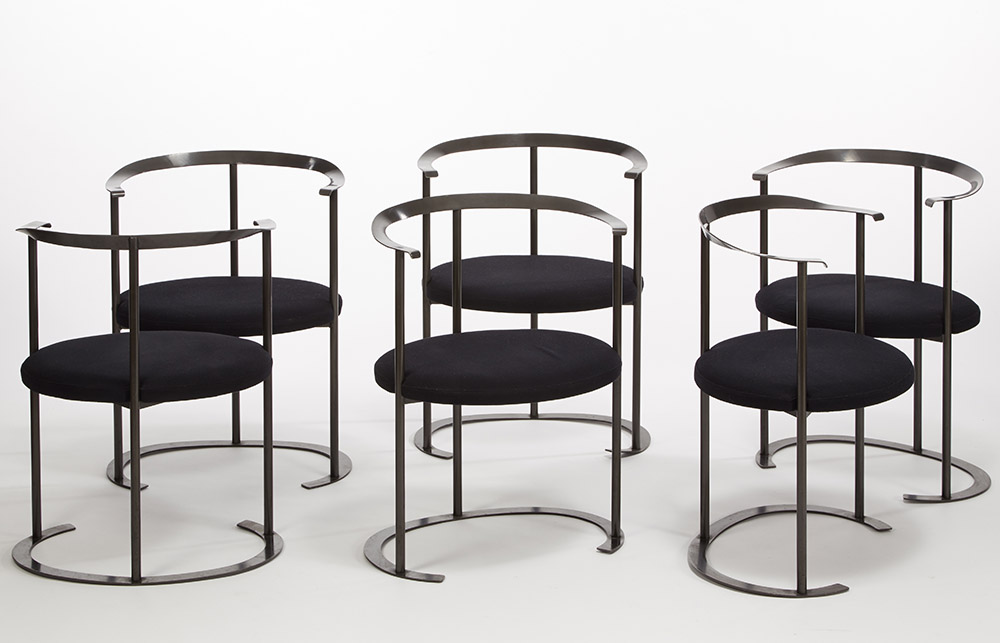 Luigi Caccia Dominioni (1913) Sei poltrone modello "Catilina". Produzione Azucena, Milano dal 1962. Seduta in tessuto nero e struttura in metallo laccato grigio metallizzato (cm 56x45x72) (lievi difetti) Six armchairs model "Catilina". Produced by Azucena, Milan, since 1962. Black fabric lining and grey lacquered metal structure (cm 56x45x72) (minor defects)
