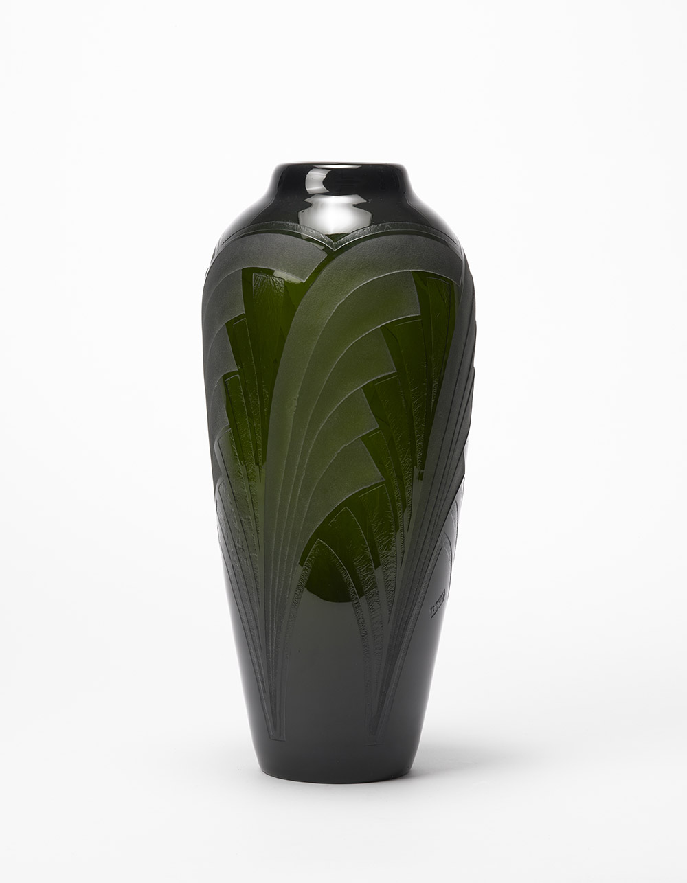 Legras Grande vaso Dèco in vetro verde stampato e decorato all'acido. Francia 1925 ca. (h cm 53) Deco vase. France, circa 1925 (h cm 53)