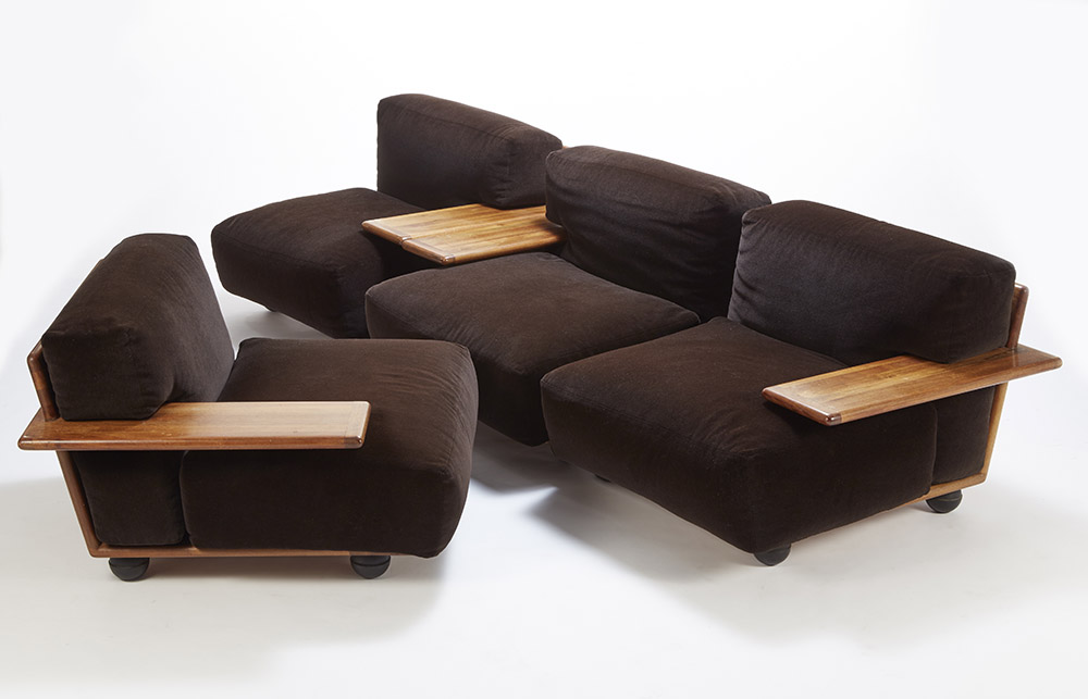 Mario Bellini ( 1935) Lotto composto da due divani scomponibili modello "Pianura". Produzione Cassina, Meda, 1971. Legno di noce e velluto (cm 185x64x91) (lievi difetti) Two sofas model "Pianura". Produced by Cassina, Meda, 1971. Walnut wood and velvet (cm 185x64x91)