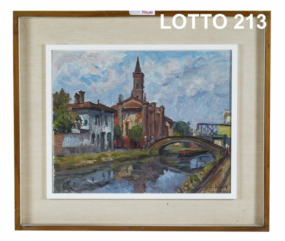 EMILIO KALCHSCHMIDT (1902 - 1983) DIPINTO OLIO SU CARTONE RAFF. CHIESA DI SAN CRISTOFORO LUNGO IL NAVIGLIO A MILANO MIS. 50 X 40