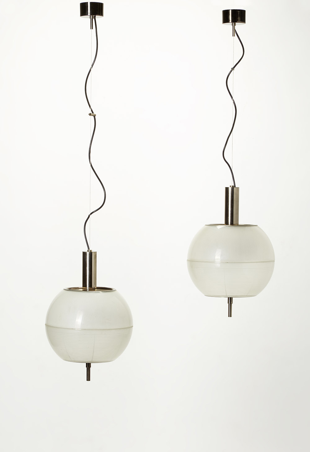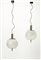 Coppia di lampade a sospensione a globo in metallo cromato e vetro stampato opalino. Produzione italiana, anni 70 (h cm 50) (lievi difetti) Pair of pendant ceiling lights. Chrome and glass globe. Produced in Italy, 1970s (h cm 50) (minor defects)