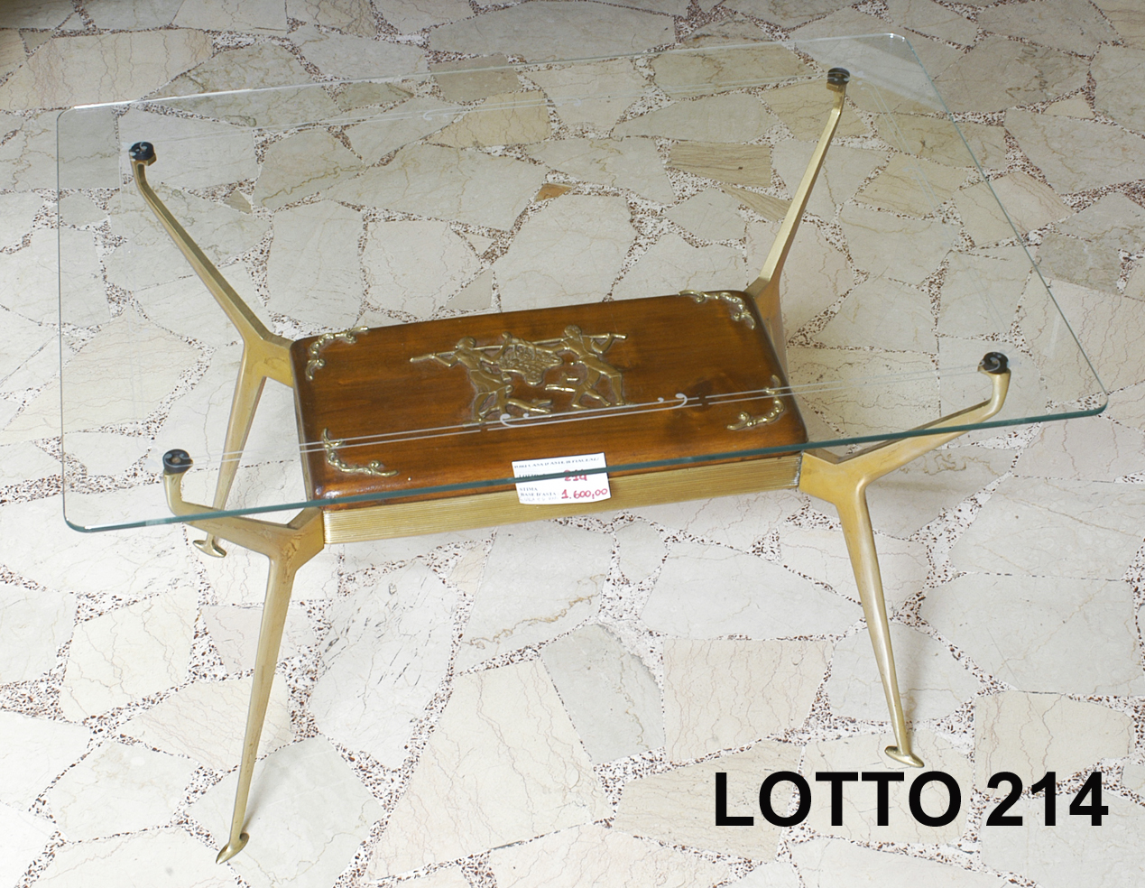 CESARE LACCA E GIO PONTI TAVOLINO DI CESARE LACCA COMPOSTO DA FORMELLA BASSORILIEVO IN OTTONE SU DISEGNO DI GIO PONTI E RIPIANO IN CRISTALLO FONTANA ARTE ANNI 50 MIS. 50 X 70 H.40