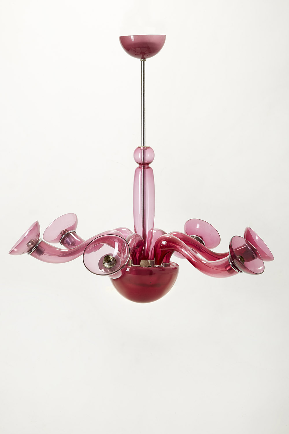 Orni Halloween Lampadario a sei braccia, modello "Leda". Produzione Veart, Murano, anni 90. Vetro soffiato trasparente ametista, metallo cromato (d cm 90) Six arm chandelier, model "Leda". Produced by Veart. Murano, 1990s. Amethystine clear blown glass and chrome-plated metal (d cm 90)
