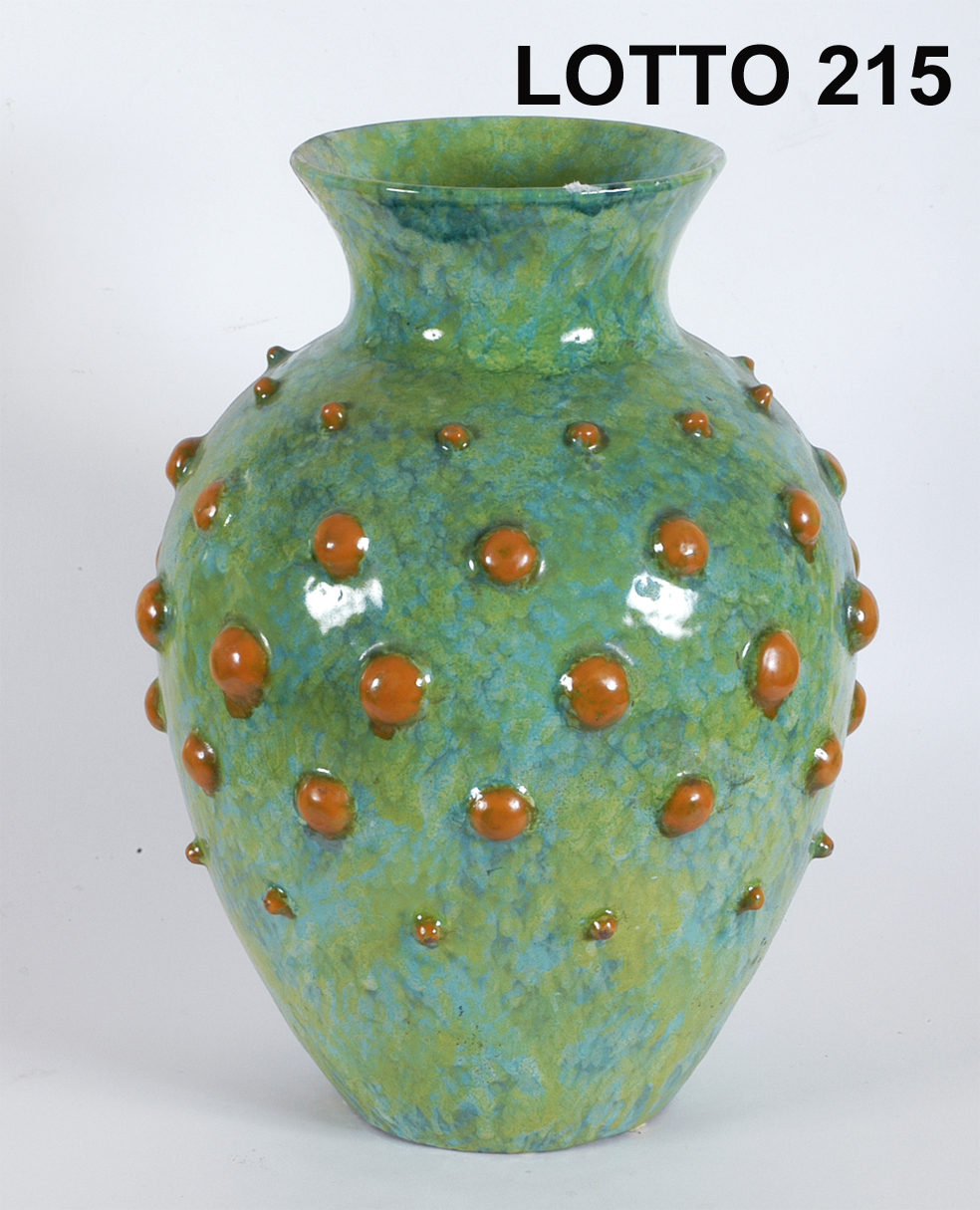 ROMETTI VASO IN MAIOLICA DIPINTA NELLE TONALITA' DEL VERDE CON INSERTI ARANCIONI H. 33
