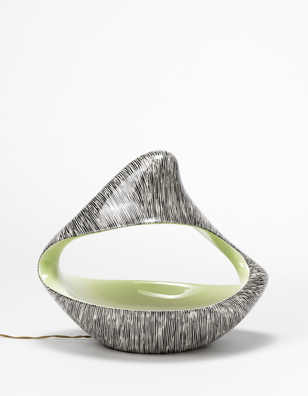 Ariele Lampada da tavolo in ceramica modellata a colaggio e smaltata in verde, bianco e nero sotto vetrina. Torino, anni 50. Marcata sotto la base "Ariele made in Italy Torino N.189" (cm 34x29x20,5) Ceramic table lamp. Turin, 1950s. Marked under the base "Ariele made in Italy Torino N.189" (cm 34x29x20,5)