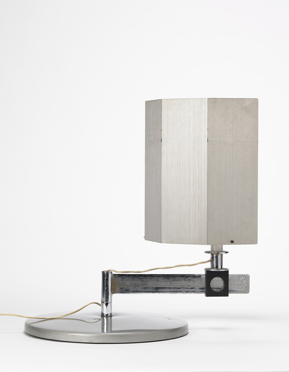 Carl Jacob Jucker (Zurigo 1902 -Schaffhausen 1997) Lampada da tavolo disegnata nel 1923 per la scuola Bauhaus di Weimar. Produzione Imago DP, Italia anni 60. Alluminio e metallo cromato e verniciato (h cm 46,5x45,5) (difetti) Table lamp designed in 1923 for the the Bauhaus school in Weimar. Produced by Imago DP, Italy, 1960s. Aluminum and chromium-plated metal (h cm 46,5x45,5) (defects)