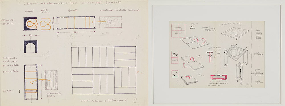 Joe Colombo (Milano 1930 -Milano 1971) Lotto di due disegni di arredi, rispettivamente di una "Libreria ad elementi singoli od accoppiati pensili" e di un tavolo smontabile. Milano anni 60. Pennarelli e inchiostro nero su carta (cm 41,5 x 29,5 e 41,5 x30) Two drawings of furnitures. Milano, 1960s. Pen and ink on paper (cm 41,5 x 29,5 e 41,5 x30)