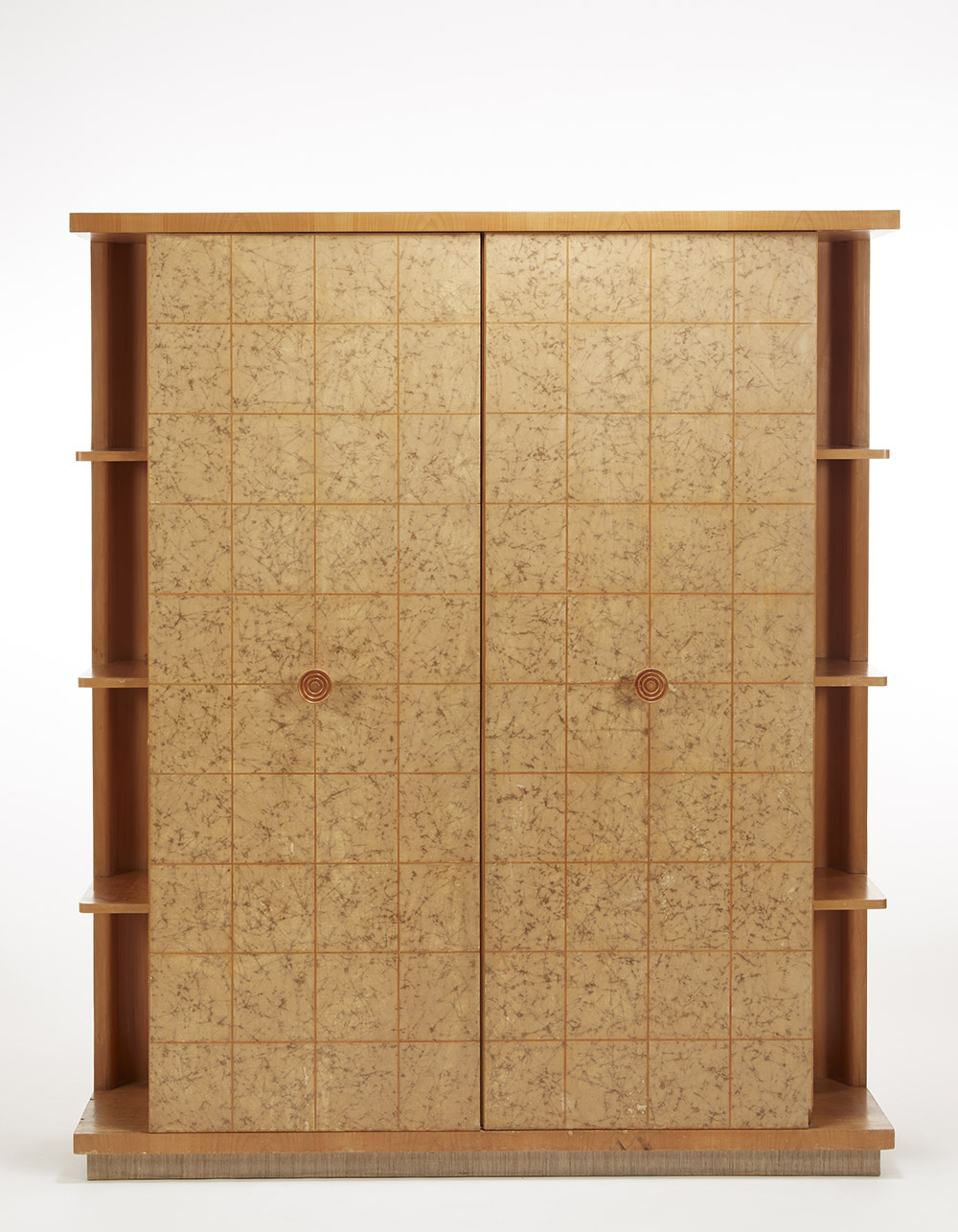 Pier Giulio Magistretti (attribuito) Armadio a due ante scorrevoli con fronte a campi quadrati in buxus marmorizzato e intarsiati a listelli. Quattro mensole su ogni fianco. Italia, anni 30 (cm 160x189x42) (difetti) Provenienza: Ca' del Fogher, Cortina d'Ampezzo, 1936, progettata dall'architetto Pier Giulio Magistretti Two doors cabinet with four shelves on each side. Italy, 1930s (cm 160x189x42) (defects) Provenance: Ca' del Fogher, Cortina d'Ampezzo, 1936, designed by Pier Giulio Magistretti