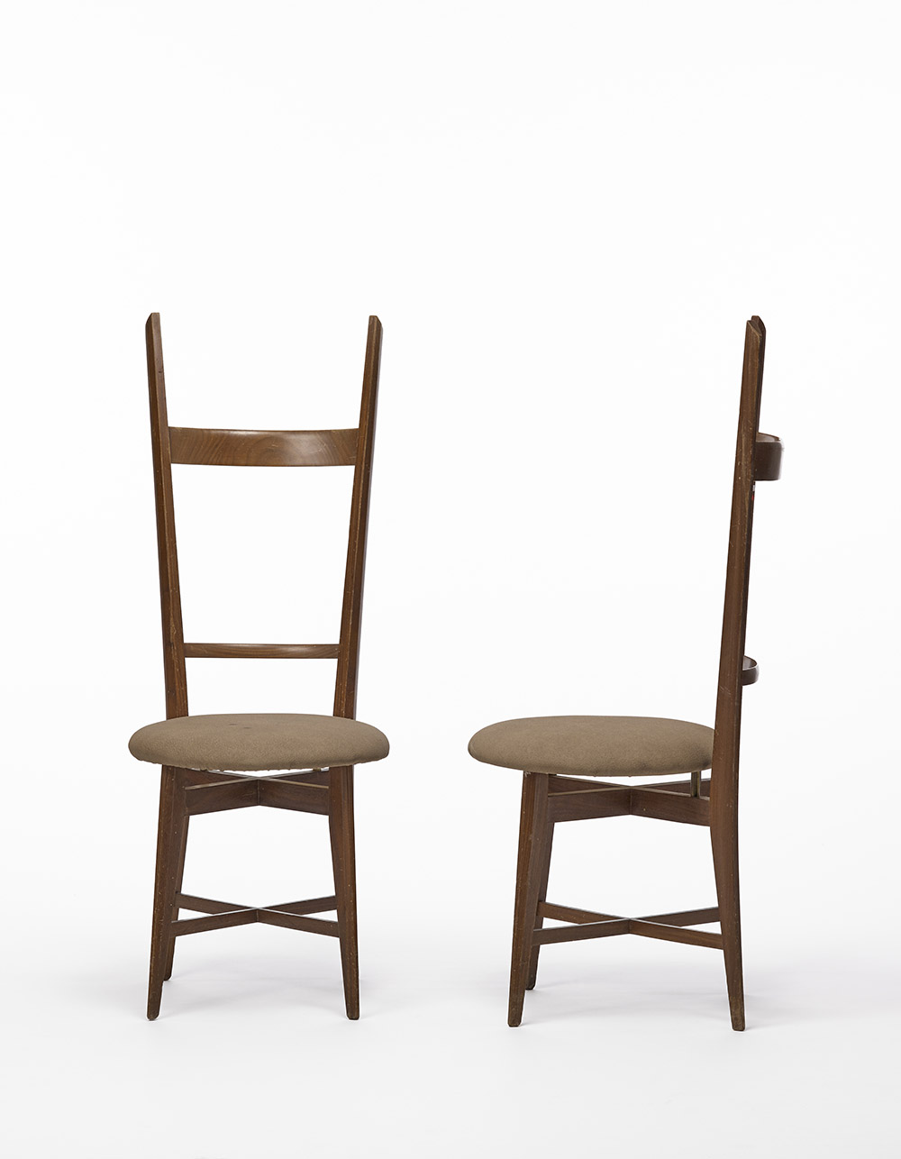 Coppia di sedie a schienale alto in legno teak massello. Italia anni 60 (cm 40x114x45) (lievi difetti) Pair of chairs in teak. Italy, 1960s (cm 40x114x45) (minor defects)