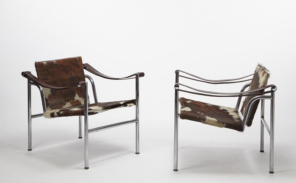 Le Corbusier, Pierre Jeanneret, Charlotte Perriand ( - ) Coppia di poltroncine modello "LC1". Produzione Cassina, Meda, anni 70 (Disegno 1928). Struttura in tubolare metallico cromato, schienale e seduta rivestiti in cavallino. Firmate a incussione (cm 60x64x64) (lievi difetti) Pair of armchairs, model "LC1". Metal and pony skin. Produced by Cassina, Meda, 1970s. Signed. (cm 60x64x64) (minor defects)