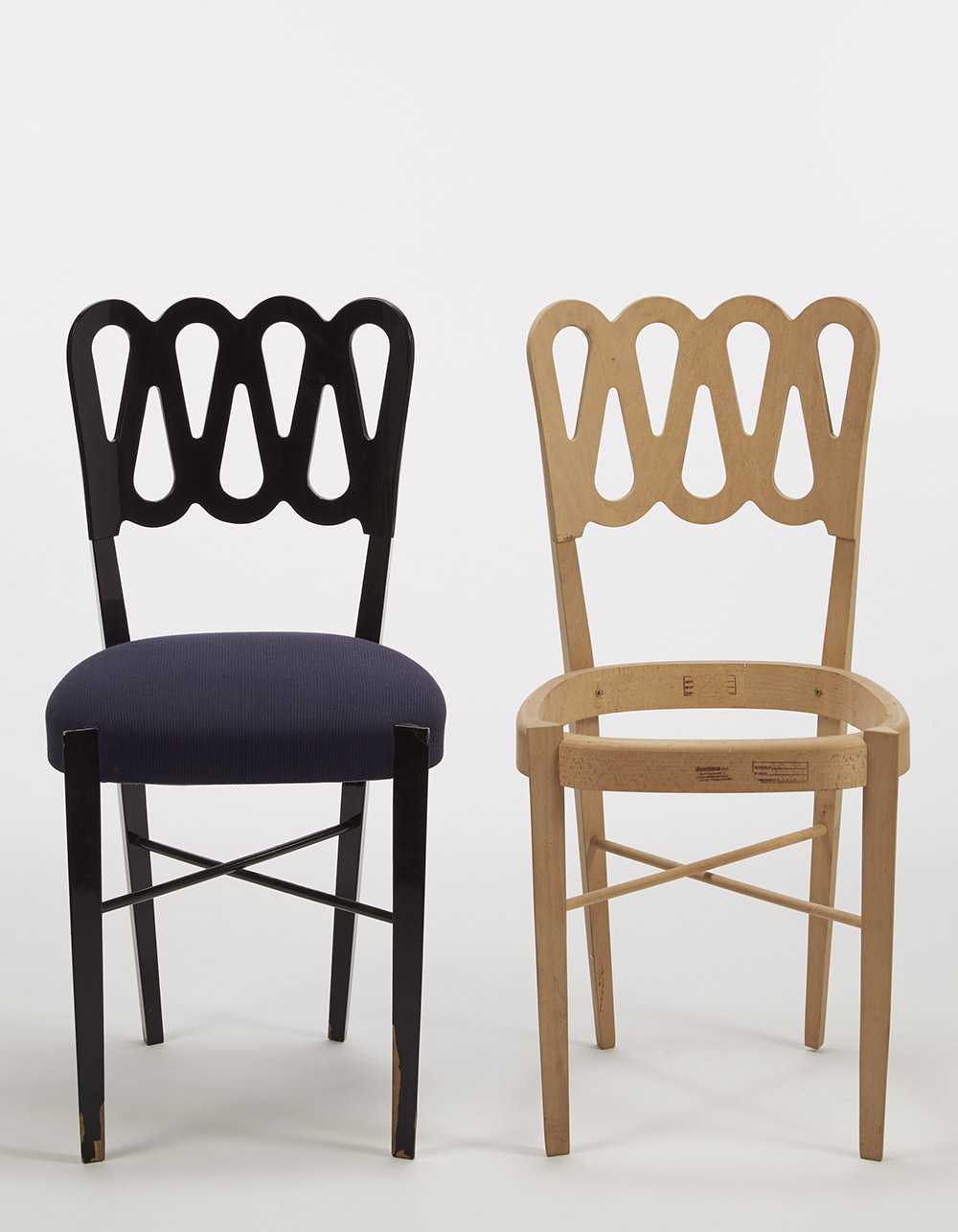 Gio Ponti (Milano 1891 - 1979) Due sedie modello "969". Produzione Montina, Udine 1969. Legno laccato nero, tessuto blu. Un esemplare è semilavorato privo di laccatura e reca il marchio a fuoco e a inchiostro della manifattura (cm 44x85x46) (lievi difetti) Provenienza: collezione privata, già nelle rimanenze di magazzino del produttore. Bibliografia: "Casa Vogue Italia", n. 207, aprile 1989 , p. 123; Gio Ponti. A world, a cura di Marco Romanelli, Abitare Segesta, Milano 2002, p. 30-31; "Elle", vol. 20, Ed. 12, 2005 p. 149 Two chairs, model "969". Produced by Montina, Udine 1969. Lacquered black wood, blue fabric. (cm 40x83x41) (minor defects) Provenance: private collection. Bibliography: "Casa Vogue Italia", n. 207, aprile 1989 , p. 123; Gio Ponti. A world, a cura di Marco Romanelli, Abitare Segesta, Milano 2002; "Elle", vol. 20, Ed. 12, 2005 p. 149