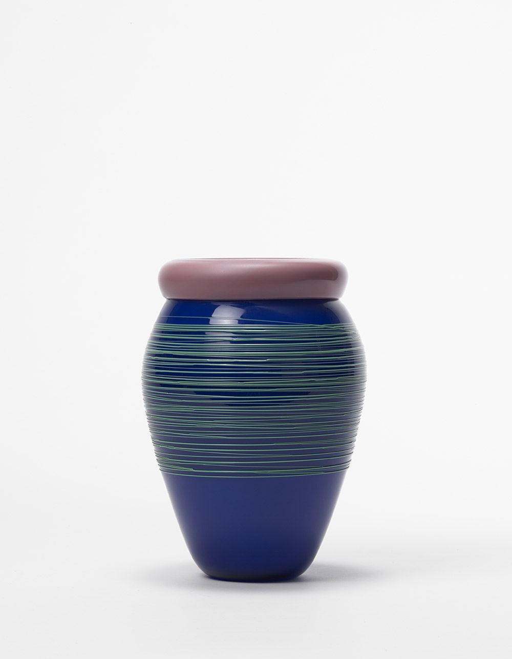Toots Zynsky (Boston 1951) Vaso della serie "Chiacchiera". Venini, Murano 1984. Corpo a forma di otre in vetro opaco blu, decorato da filamenti vitrei azzurri applicati a spirale con bocca ripiegata verso l'esterno di colore rosa. Firmato "Zinsky x venini 1984" (h cm 25) Bibliografia: A. Venini Diaz de Santillana, Venini. Catalogo ragionato 1921-1986, Skira, Milano 2000, p. 232, scheda 270 Vase, "Chiacchiera" series. Venini, Murano 1984. Signed "Zinsky x venini 1984" (h cm 25) Bibliography: A. Venini Diaz de Santillana, Venini. Catalogo ragionato 1921-1986, Skira, Milano 2000, p. 232, scheda 270