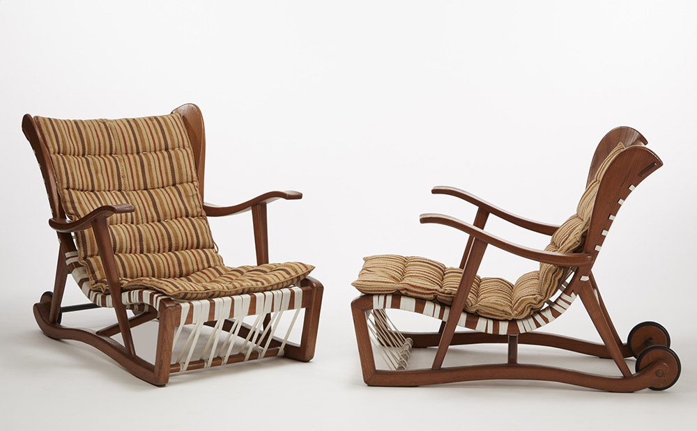 Guglielmo Pecorini Coppia di poltrone in legno massello, ruote in legno, struttura della seduta e dello schienale in fettucce di tessuto, cuscini rivestiti in canapa. Italia anni 50 (cm 71x98x78) Bibliografia: M. R. Rogers, Italy at work. Her renaissance in design today, Catalogo della mostra (New York 1950), Compagnia Nazionale Artigiana, Roma, 1950, p. 72 Pair of armchairs, wood and woven hemp. Italy, 1950s (cm 71x98x78) Bibliography: M. R. Rogers, Italy at work. Her renaissance in design today, Catalogo della mostra (New York 1950), Compagnia Nazionale Artigiana, Roma, 1950, p. 72