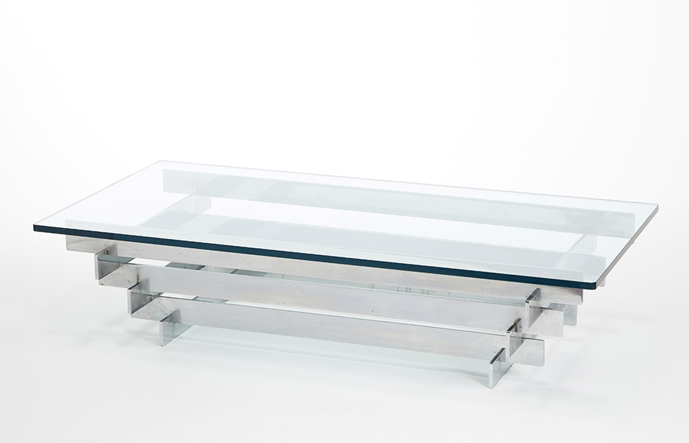 David Hicks "Tavolo scultura", presentato alla Galleria Pitti, Roma, 1969 ca. Metallo cromato, cristallo temperato di forte spessore (cm 150x35x75) (lievi difetti) "Tavolo scultura", presented at the Galleria Pitti, Rome, 1969 ca. Chrome metal, crystal. (cm 150x35x75) (minor defects)