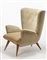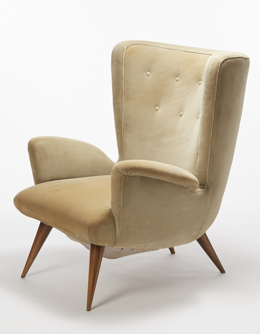 Poltrona imbottita con struttura in legno, rivestimento in velluto beige e gambe troncoconiche in mogano. Esecuzione Domus Nostra, Bologna, 1955 ca. (cm 76x94x74) (lievi difetti) Provenienza: collezione privata, Bologna. Armchair, wood structure and velvet lining. Domus Nostra, Bologna, circa 1955. (cm 76x94x74) (minor defects) Provenance: private collection, Bologna.