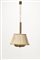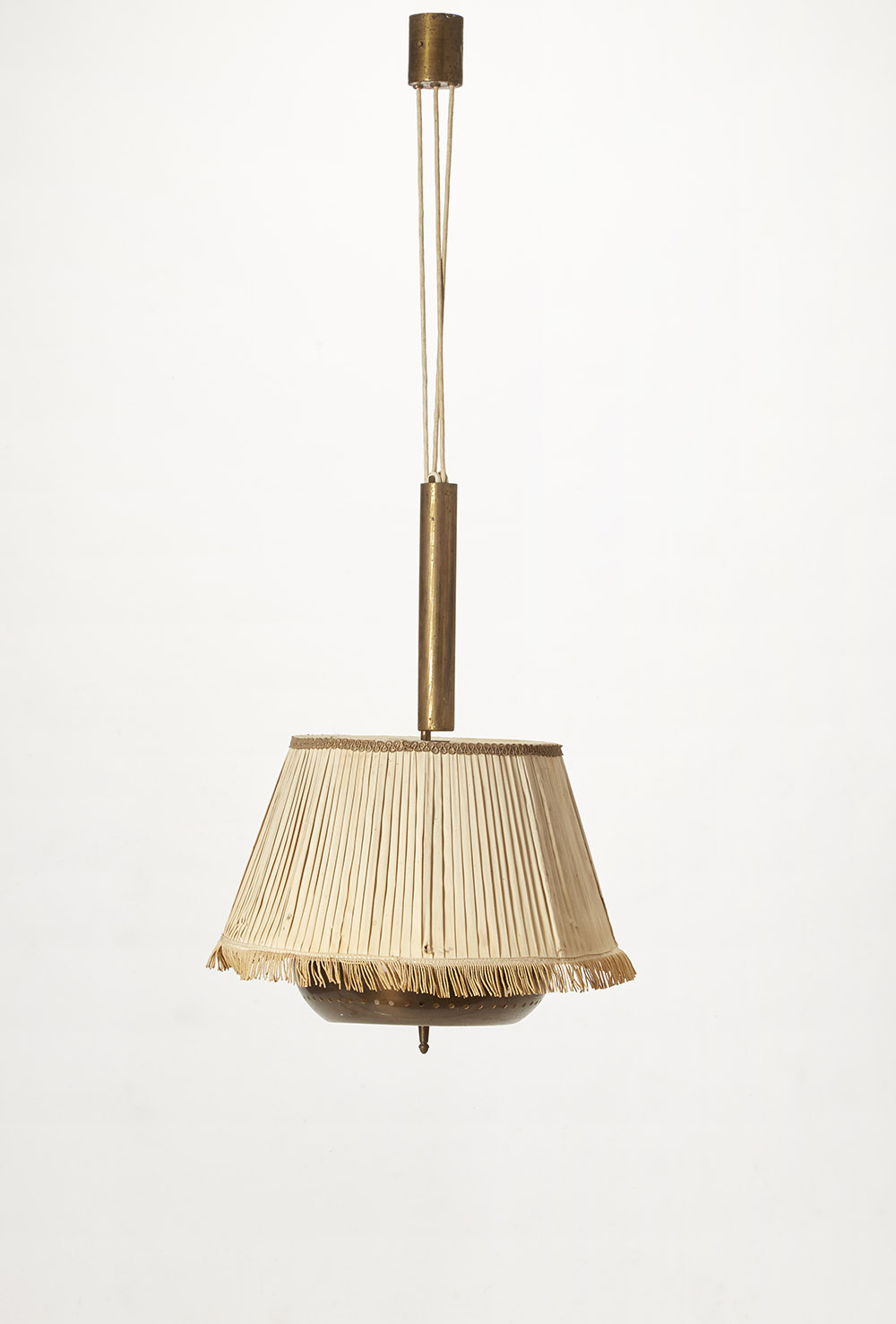 Gino Sarfatti (attribuito) Lampada a saliscendi con struttura in ottone, schermo in vetro satinato e zigrinato, paralume in tessuto. Probabile produzione Arteluce, Milano anni 40 (d cm 46, h cm 107) (lievi difetti) Ceiling lamp. Brass structure, glass, fabric. Probable manufacture Arteluce, Milano, 1940s (d cm 46, h cm 107) (minor defects)