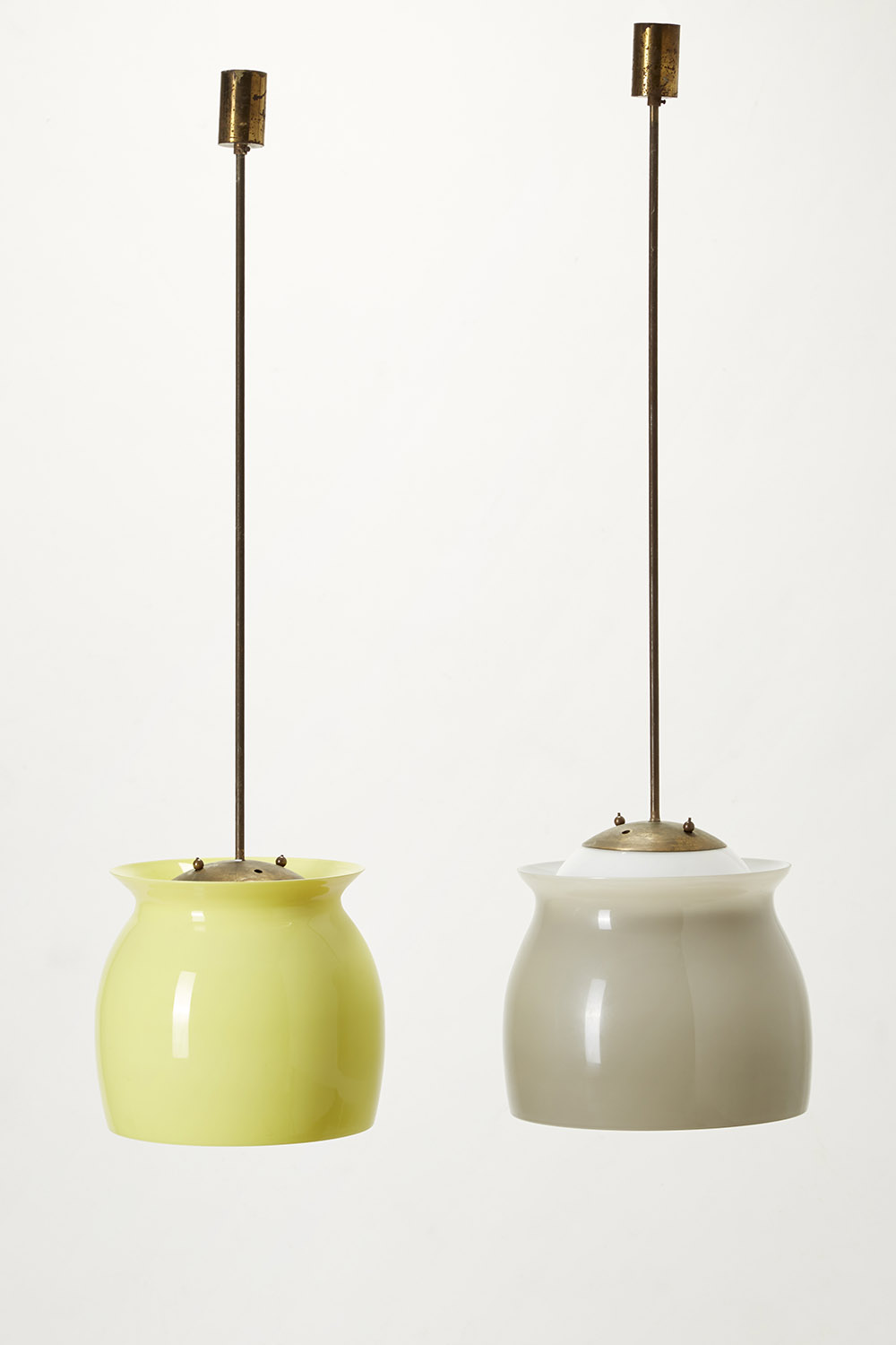 Franco Albini ( 1905 - 1977) Due lampade a sospensione disegno n. 4023. Esecuzione Venini, Murano 1955 ca. Asta in ottone, paralume a globo in vetro lattimo e contro calotta orientabile in vetro incamiciato giallo e tortora chiaro (d cm 22, h cm 78) (difetti a un globo) Bibliografia: "Domus", n. 314, gennaio 1956, p. 46 da leggersi con errata corrige in "Precisazioni", "Domus" n. 316, marzo 1956 Two ceiling lamps, drawing n. 4023. Venini, Murano circa 1955. Brass, glass (d cm 22, h cm 78) (defects at one globe) Bibliography: "Domus", n. 314 gennaio 1956, p. 46 da leggersi con errata corrige in "Precisazioni", "Domus" n. 316, marzo 1956
