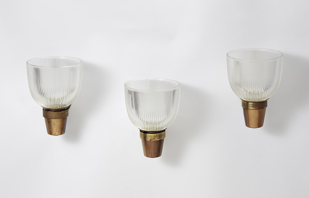 Ignazio Gardella ( 1905 - 1999) Tre appliques modello "LP5". Produzione Azucena, Milano 1955 ca. Diffusore in vetro pressato, struttura in ottone lucidato e brunito. Marchio della manifatura incusso dietro il supporto (h cm 23) Three appliques, model “LP5". Produced by Azucena, Milan, circa 1955. Glass and brass. (h cm 23)