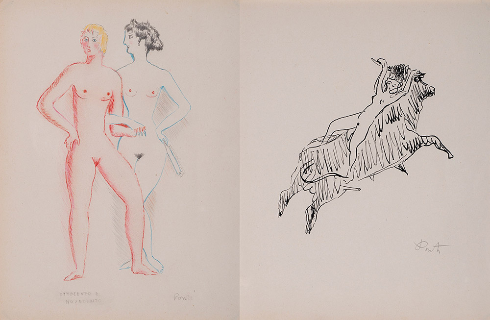 Gio Ponti (Milano 1891 - 1979) Lotto di due disegni, rispettivamente "Ottocento e Novecento", allegoria personificata da due figure femminili e probabile raffigurazione del mito di Europa. Milano, anni 40. Firmati in basso a destra. Matite colorate; inchiostro nero su carta. In cornice (cm 26x19,5 e cm 26x21) Provenienza: collezione privata, Milano Two drawings depicting respectively Ottocento e Novecento and a probable representation of the myth of Europe. Milan, 1940s. Signed lower right. Framed (cm 26x19,5 and cm 26x21) Provenance: Private collection, Milan