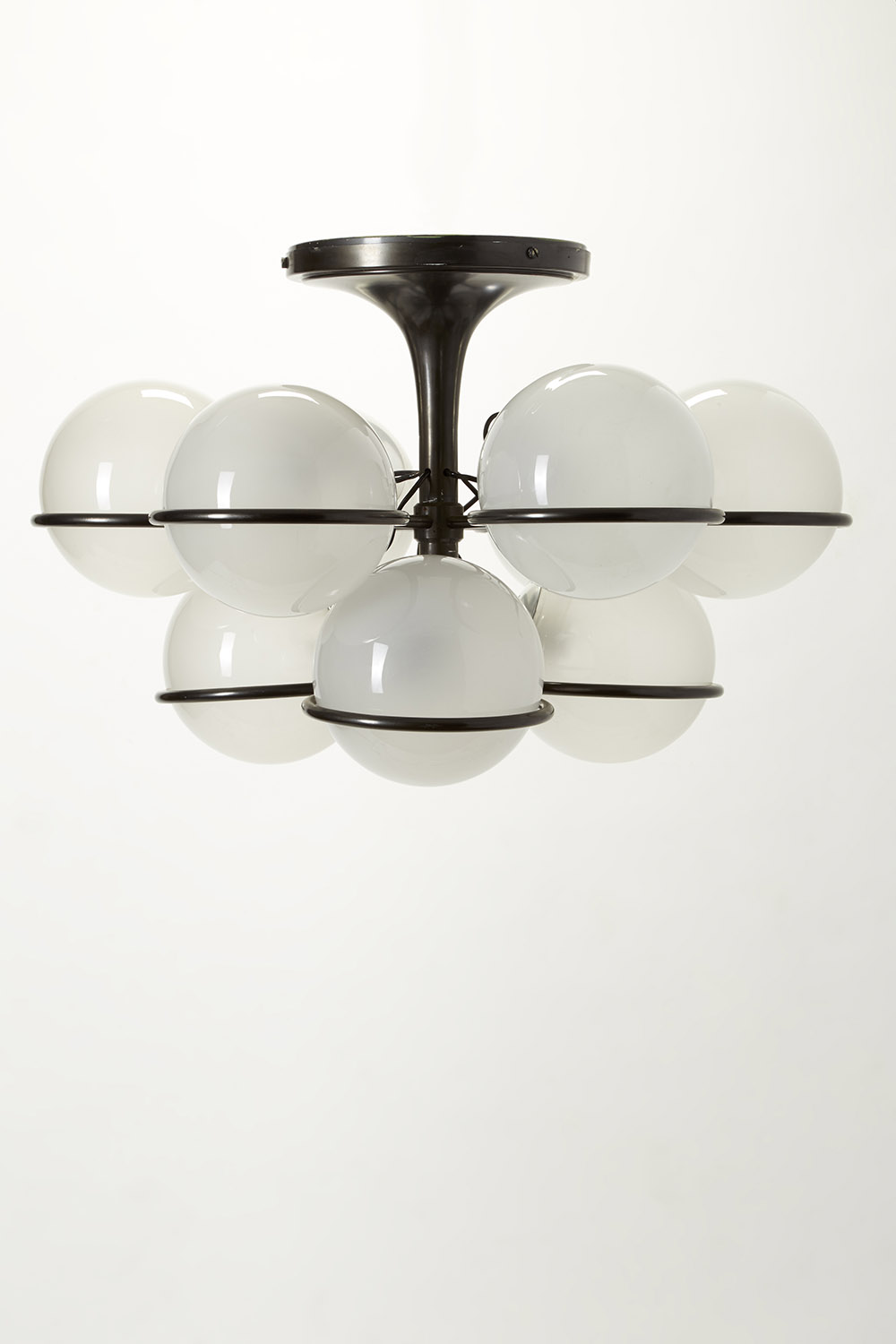Gino Sarfatti ( 1912 - 1985) Lampadario a nove luci modello "2042/9". Produzione Arteluce, Milano 1963. Metallo laccato nero perlato, sfere in vetro satinato. (d cm 73, h cm 43) (lievi difetti) Bibliografia: M. Romanelli, S. Severi, Gino Sarfatti. Opere scelte 1938-1973, Silvana Editoriale, Cinisello Balsamo, 2012, p. 479; Catalogo Arteluce, s.e., s.l., s.d., p. 25 Nine lights chandelier model "2042/9". Produced by Arteluce, Milan, 1963. Black lacquered metal, glazed glass (d cm 73, h cm 43) (minor defects) Bibliography: M. Romanelli, S. Severi, Gino Sarfatti. Opere scelte 1938-1973, Silvana Editoriale, Cinisello Balsamo, 2012, p. 479; Catalogo Arteluce, s.e., s.l., s.d., p. 25