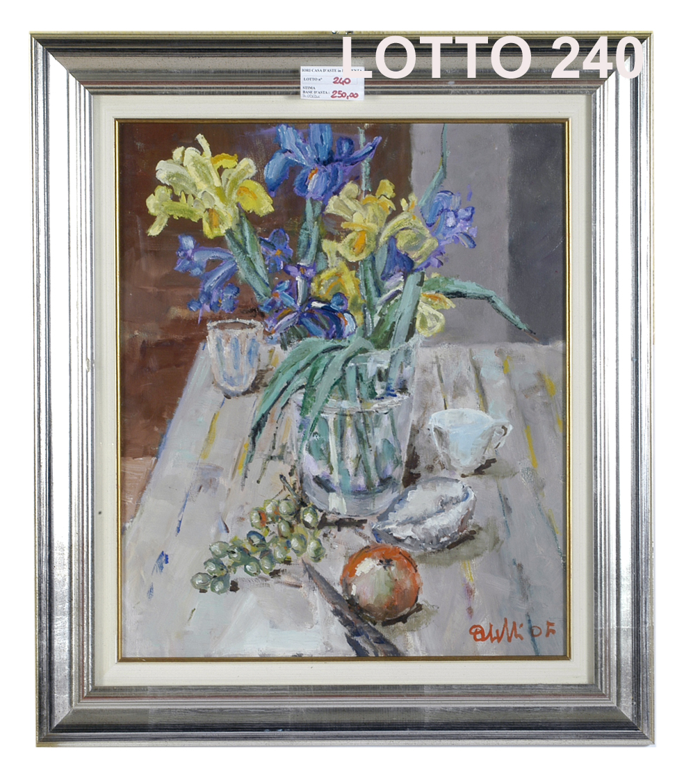 SANDRO ODELLI DIPINTO OLIO SU TAVOLA RAFF. NATURA MORTA CON IRIS MIS. 50 X 60
