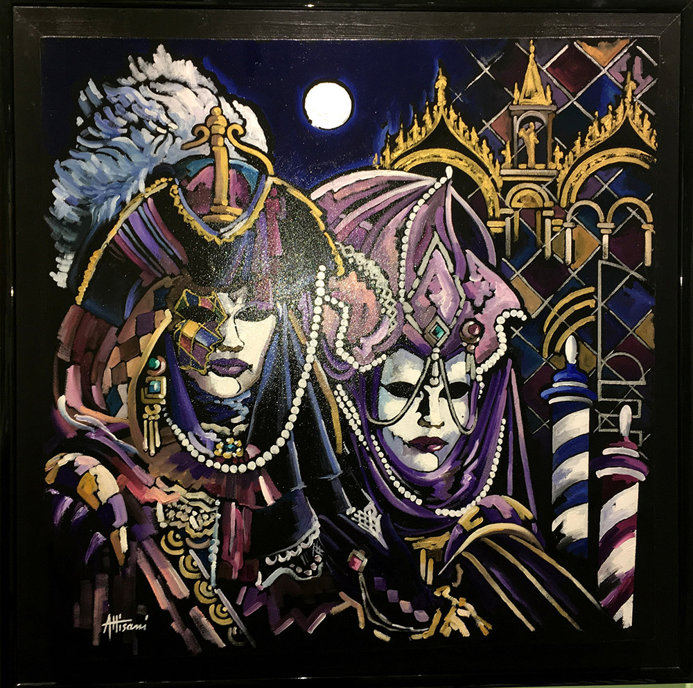 Sergio Attisani "Maschere veneziane" - olio su tela - cm 80x80 - Opera incorniciata - Firma in basso a sx - Autentica dell'artista su foto