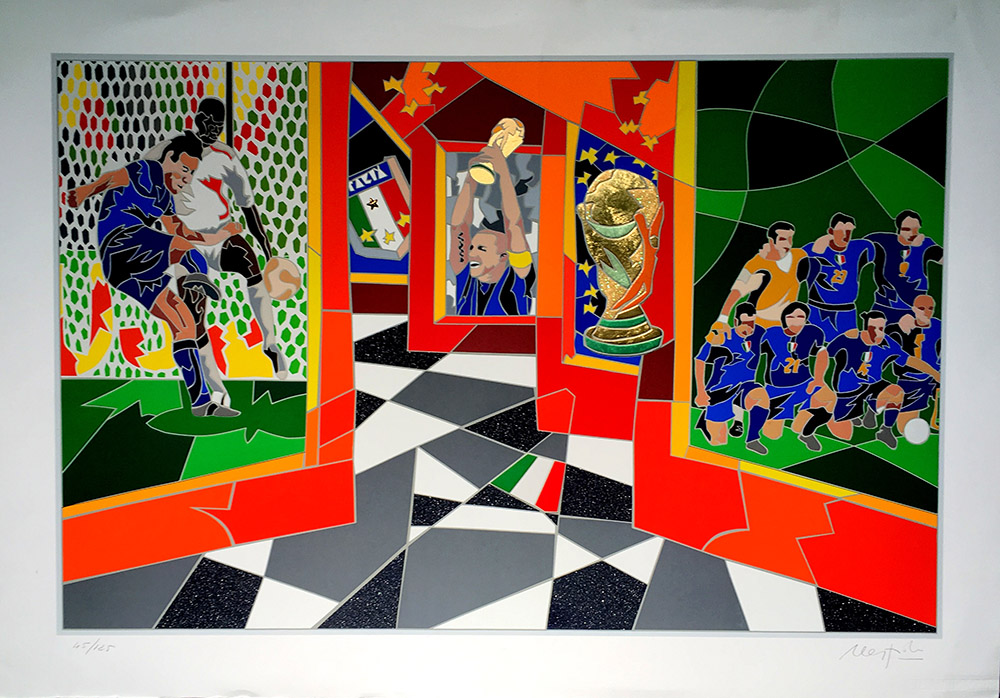 Ugo Nespolo "Il calcio" - Serigrafia e collage - Es. 42/125 - cm 70x100 - Firma in basso a dx - Certificato di autenticità MEDIART al retro