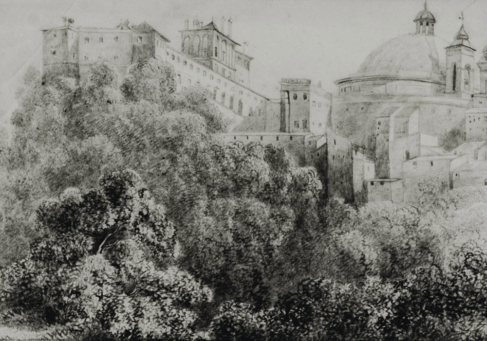 ARTISTA FRANCESE DEL XIX SECOLO Veduta di Palazzo Chigi ad Ariccia con la Cupola di Santa Maria Assunta, 1830 circa Matita su carta, 19,9 x 27,5 cm Al retro timbro della Collezione Iohan Quirijn van Regteren Altena Provenienza Amsterdam, collezione van Regteren-Altena Come indica il monogramma sul verso del foglio, il disegno apparteneva alla raccolta di Iohan Quirijn van Regteren Altena (1899 - 1980): artista, storico dell’arte e collezionista olandese che dal 1923 al 1926, in qualità di assistente di Fritz Lugt (1884 - 1970), ha contribuito alla catalogazione dei disegni di artisti nord europei conservati presso il museo del Louvre. FRENCH ARTIST Palazzo Chigi in Ariccia view with the Dome of St. Maria Assunta, 1830 ca. Pencil on paper, 19,9 x 27,5 cm On the back: stamp of Johan Quirijn van Regteren Altena Collection Provenance Amsterdam, van Regteren-Altena collection The drawing belonged to Iohan Quirijn van Regteren Altena collection (1899 - 1980): artist, art historin and Dutch collector who contributed in cataloging some of north european artists drawings conserved in Louvre Museum in Paris