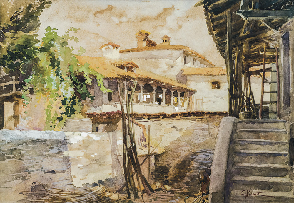 GIUSEPPE PALANTI Milano 1881 - 1946 Paesaggio con case Acquarello su carta, 34 x 49 cm circa Firma in basso a destra: G Palanti GIUSEPPE PALANTI Milan 1881 - 1946 Landscape with houses Watercolor on paper, 34 x 49 cm ca. Signed lower right: G Palanti