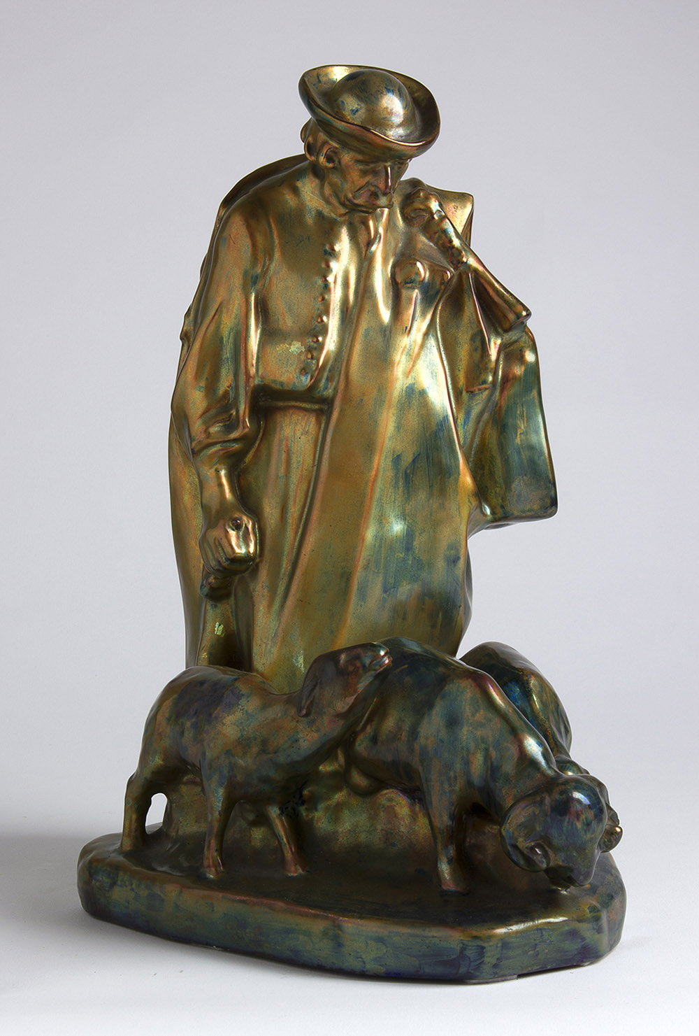 ZSOLNAY PÉCS - UNGHERIA Pastore ungherese con gregge, 1910 Scultura in ceramica smaltata, 34,5 x 15,5 x 24 cm Marchio ZSOLNAY PÉCS sotto la base ZSOLNAY PÉCS Hungarian pastor with herd, 1910 Glazed ceramic sculpture, 34,5 x 15,5 x 24 cm Brand under the base: ZSOLNAY PÉCS