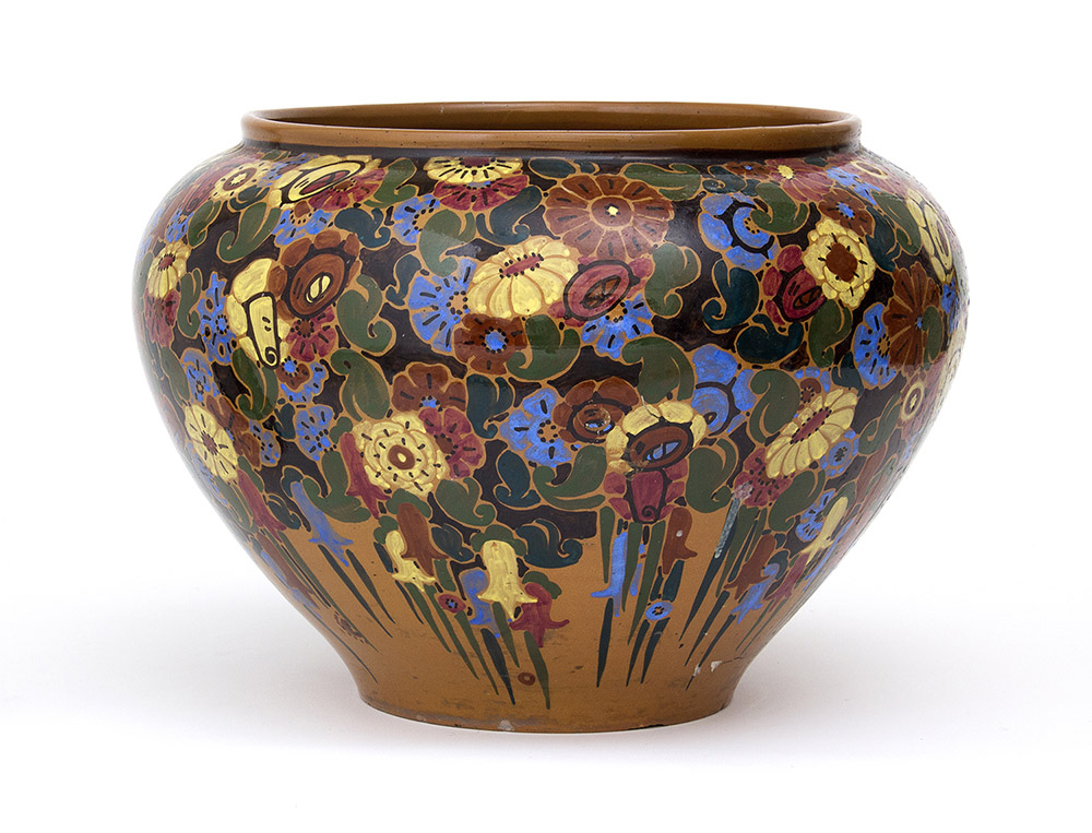 SALAMANDRA - PERUGIA Grande vaso decorato a motivi floreali, 1921 Ceramica policroma, 24,5 x 36 cm Marchio, luogo e numero del modello sotto la base: Salamandra Perugia Italy 97 SALAMANDRA - PERUGIA Big vase decorated with floreal motifs, 1921 Painted ceramic, 24,5 x 36 cm Brand, location and model number under the base: Salamandra Perugia Italy 97