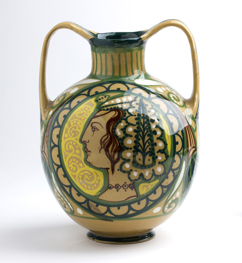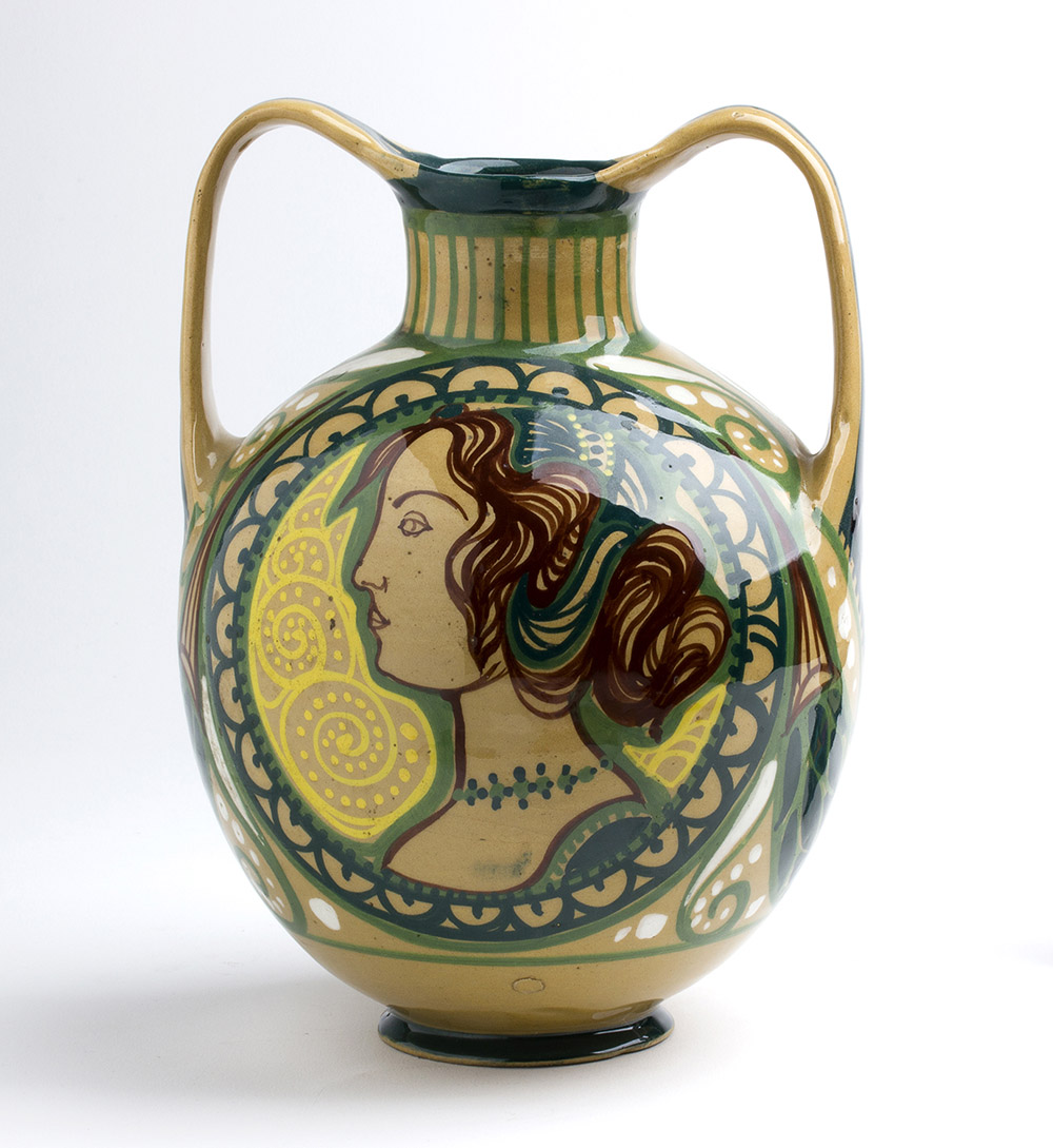 LANNI - ROMA Anfora decorata da volute vegetali e profili muliebri, Anni ‘20 Ceramica dipinta, h 25 cm Impresso sotto la base il marchio: LANNI - ROMA Condition report Una piccola sbeccatura alla base LANNI - ROMA 20’s Amphora with vegetable spirals and feminine profiles decoration Painted ceramic, h 25 cm Inscribed under the base: LANNI - ROMA Condition report A little defect on the base
