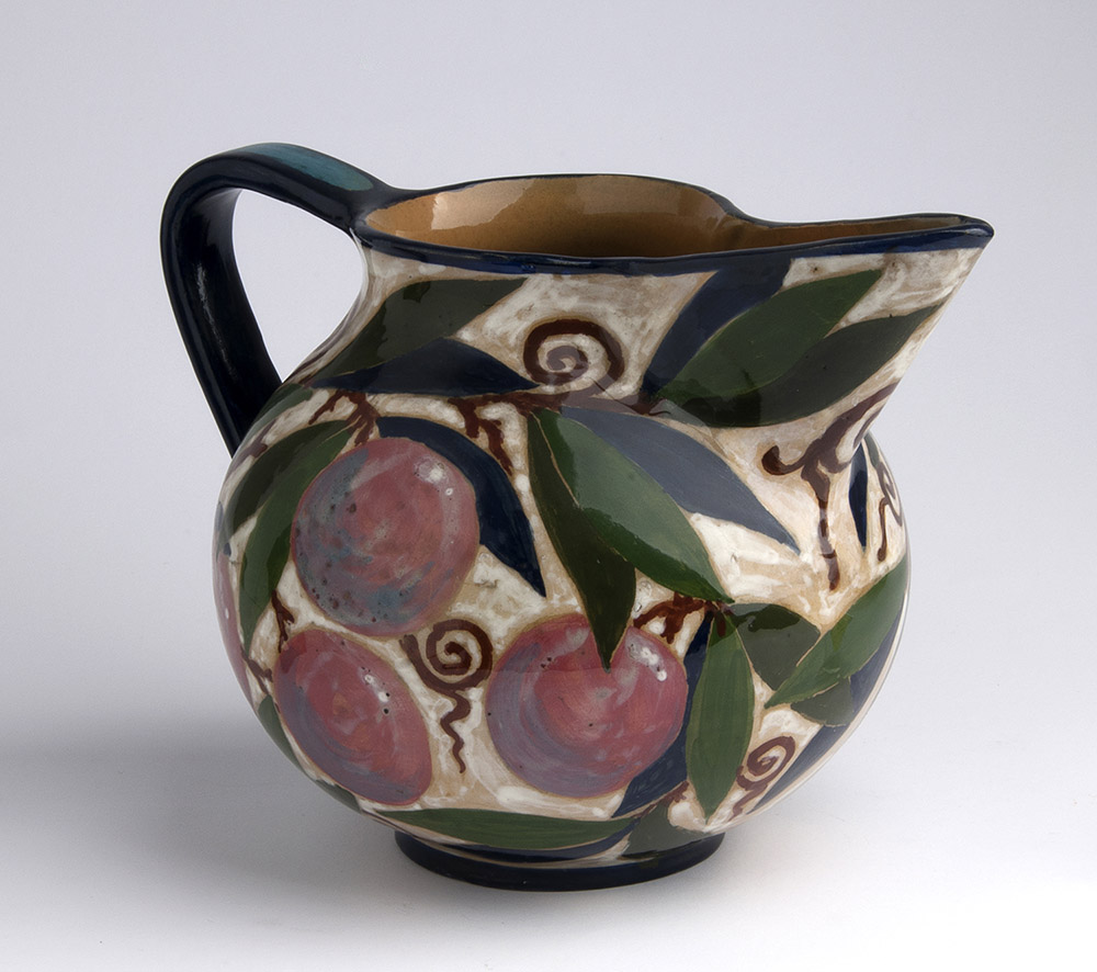 SQUARCIARELLI - FRATELLI TIDEI Brocca decorata a motivi di frutti e foglie, Anni ‘20/’30 Ceramica dipinta in policromia, h 16,5 cm Reca sotto la base il marchio: Fratelli Tidei Grottaferrata SQUARCIARELLI - FRATELLI TIDEI Jug decorated with fruits and leaves motif, 20’s - 30’s Painted ceramic, h 16,5 cm Inscribed under the base: Fratelli Tidei Grottaferrata