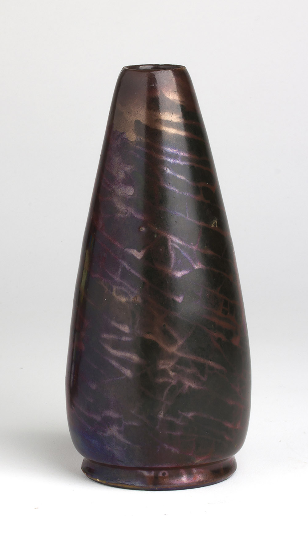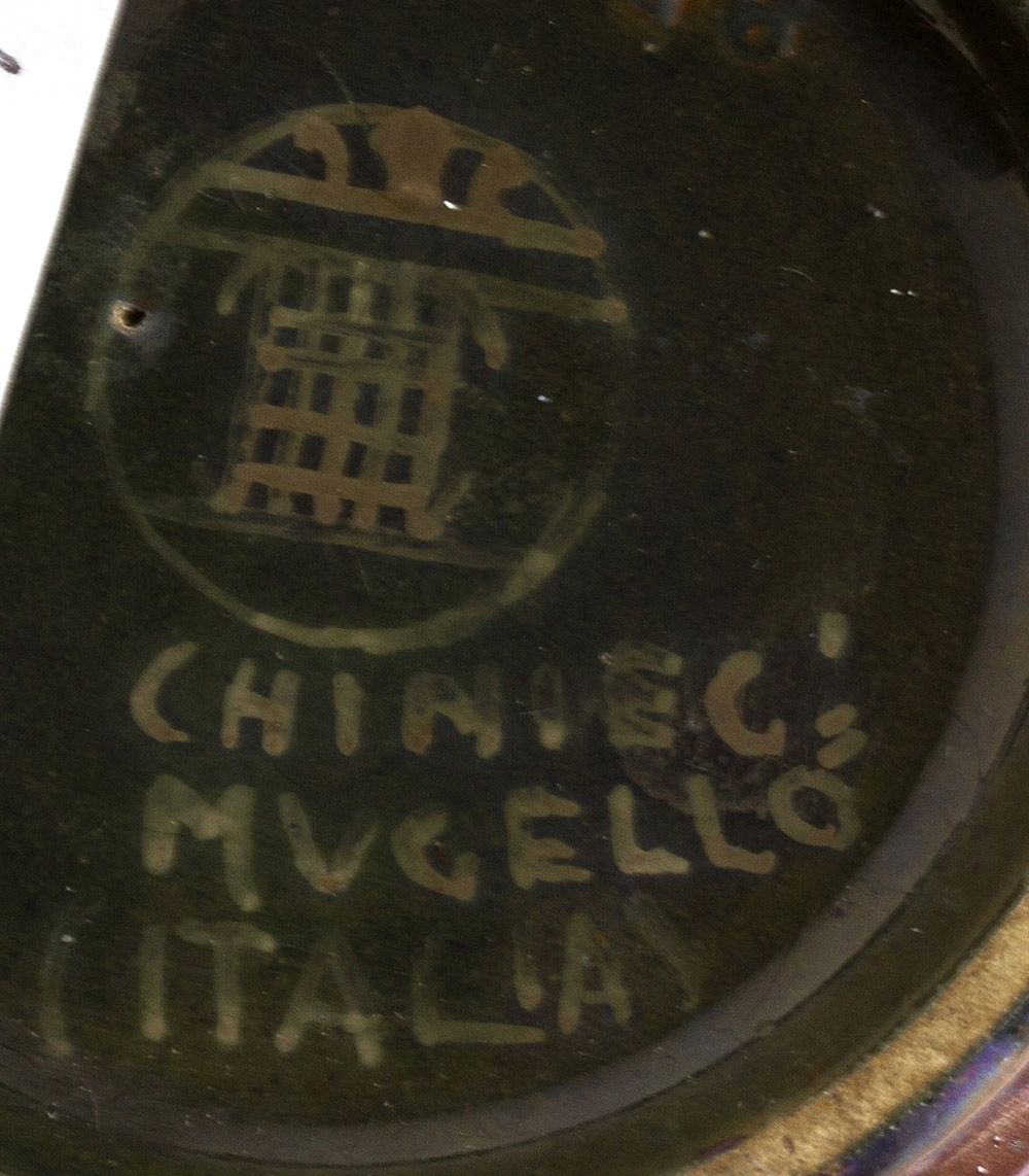 GALILEO CHINI Firenze, 1873 - 1956 Vaso troncoconico, 1906 - 19 (ideazione), 1919-25 (realizzazione) Manifattura Fornaci S. Lorenzo Maiolica a lustri dipinto verde oliva, bronzo e viola, h 17 cm Reca marchio in bianco su fondo verde-oliva: grata entro cerchio e scritta CHINI E C. MUGELLO (Italia) e n. 216 impresso Provenienza Collezione Stefanelli Torossi Esposizioni e Pubblicazioni La Manifattura Chini dall’Arte della Ceramica alle Fornaci S. Lorenzo, Palazzo delle Esposizioni, Faenza 1979, n. 122; Galileo Chini pittore e decoratore, Galleria Arco Farnese, Roma 1982. p. 58 GALILEO CHINI Florence, 1873 - 1956 Vase, 1906-19 (ideation), 1919-25 (realization) Fornaci S. Lorenzo manufacture Fornaci S. Lorenzo Factory, Green, bronze and violet luster majolica, h 17 cm Mark on the green base: CHINI E C. MUGELLO (Italia), 2016. Provenance Stefanelli Torossi Collection Exhibited and Literature La Manifattura Chini dell’Arte della Ceramica alle fornaci S.Lorenzo, Palazzo delle Esposizioni, Faenza 1979, n. 122; Galileo Chini pittore e decoratore, Galleria Arco Farnese, Rome 1982. p.58