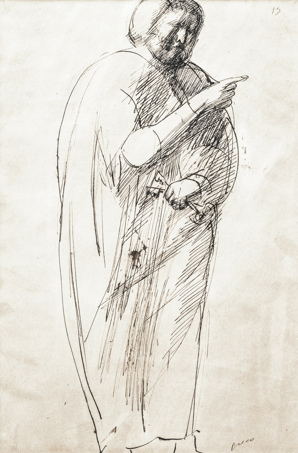 EMILIO GRECO Catania 1913 - Roma 1987 Studio per S. Pietro (al verso: Nudo femminile), 1948 circa China su carta, 43,5 x 28,5 cm circa Firma in basso a destra: Greco Provenienza Collezione Stefanelli Torossi Esposizioni Disegno italiano 1900-1950, Galleria Arco Farnese, Roma 1989, n. 55; Disegno italiano 1900-1950, Archivio Arco Farnese, Roma 1999, n. 47 EMILIO GRECO Catania 1913 - Rome 1987 Study for S. Peter (on the back: Female nude), 1948 ca Indian ink on paper, 43,5 x 28,5 cm Signed lowe right: Greco Provenance Stefanelli Torossi Collection Exhibited Disegno italiano 1900-1950, Arco Farnese Gallery, Rome 1989, no.55; Disegno italiano 1900-1950, Arco Farnese Archive, Rome 1999, no. 47.