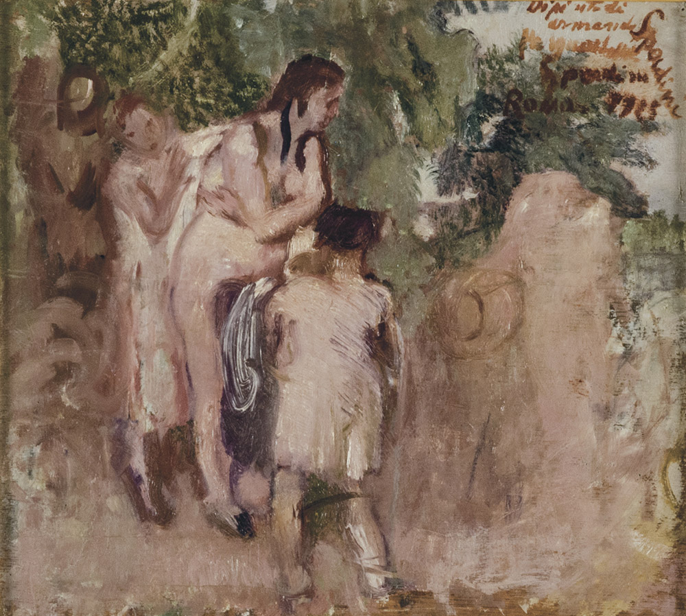 ARMANDO SPADINI Firenze 1883 - Roma 1925 Bozzetto per le “Bagnanti”, 1923 Olio su tavola, 49,5 x 55 cm Scritta in alto a destra parzialmente decifrabile: Dipinto di Armando Spadini ... Roma 1923 ... ARMANDO SPADINI Florence 1883 - Rome 1925 Sketch for “Bathers”, 1923 Oil on board, 49,5 x 55 cm Inscribed upper right (partially legible): Painting by Armando Spadini ... Rome 1923 ...