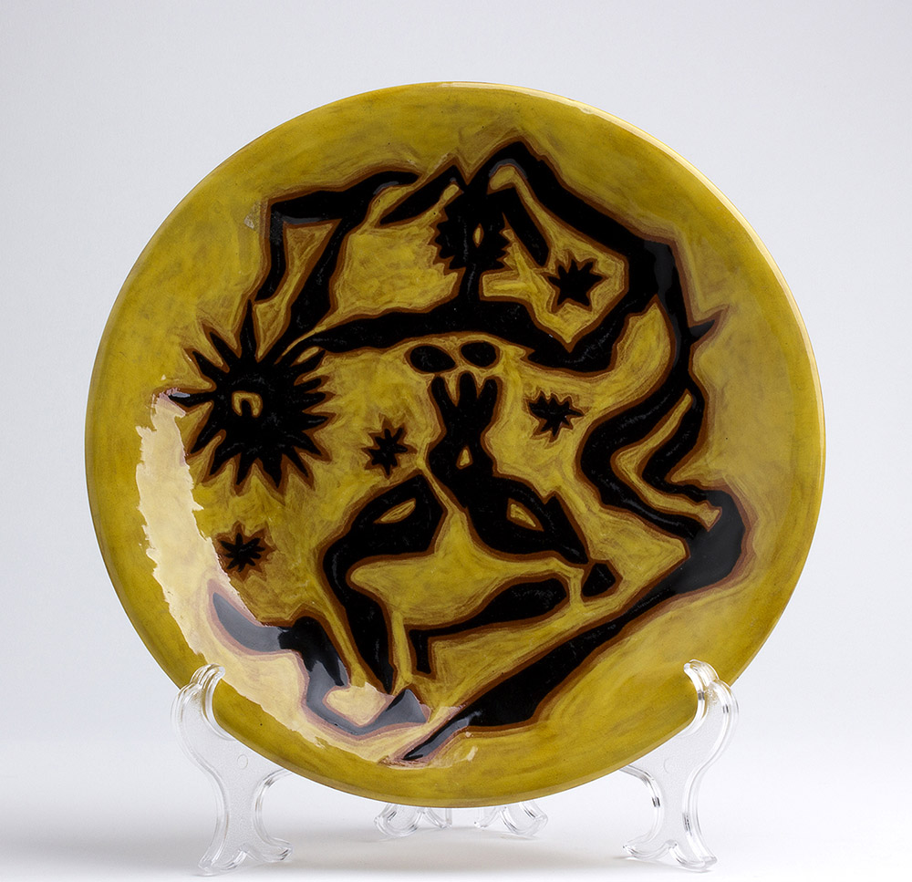 JEAN LURÇAT 1892 - 1966 Piatto decorato con figure astratte in nero su fondo giallo ocra Ceramica policroma, d 25,5 cm Firma e marchio al retro: Dessin J. Lurçat Sant-Vicens L-K JEAN LURÇAT 1892 - 1966 Plate decorated with abstract motifs on yellow ochre background Painted ceramic, d 25,5 cm Signed and inscribed on the back side: Dessin J. Lurçat Sant-Vicens L-K