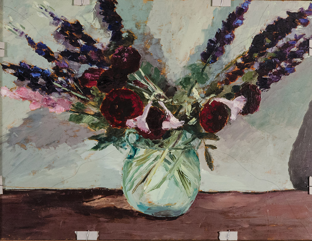 CESARINA GUALINO Casale Monferrato 1890 - Roma 1992 Vaso con fiori (al verso: bozzetto per natura morta floreale), 1957 Olio su tavola, 59 x 44,5 cm Firma e data in alto a destra: C. Gualino 1957 CESARINA GUALINO Casale Monferrato 1890 - Rome 1992 Flower vase (still life sketch on the back), 1957 Oil on board, 59 x 44,5 cm Signed and dated upper right: C Gualino 1957