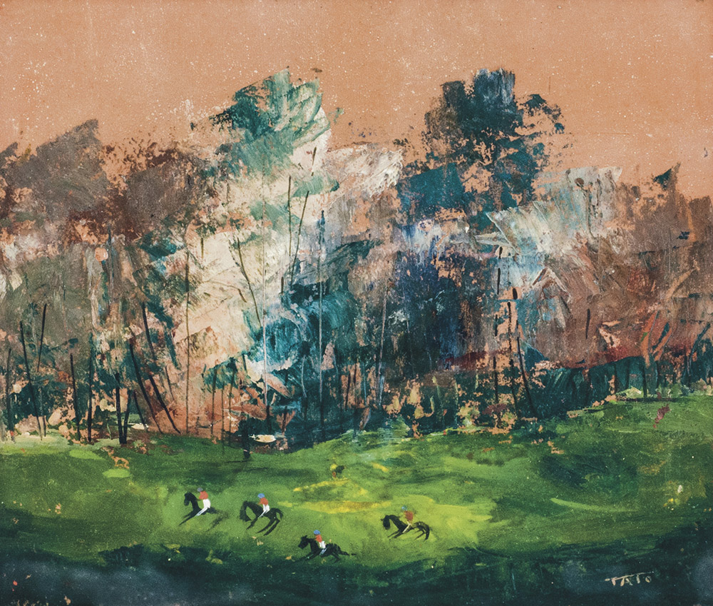 TATO Bologna 1896 - Roma 1974 Paesaggio con giocatori di polo Olio su tavoletta, 20 x 24 cm circa Firma in basso a destra: TATO Parere verbale positivo dell’Archivio Tato a cura del generale Salvatore Ventura Autentica a richiesta TATO Bologna 1896 - Rome 1974 Landscape with polo players Oil on board, 20 x 24 cm ca. Signed lower right: TATO Tato Archive verbal positive opinion by General Salvatore Ventura Certification on request