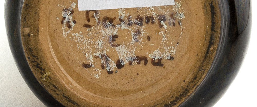 RENATO BASSANELLI Civita Castellana (Viterbo) 1896 - Roma 1973 Vaso, 1920 Terracotta dipinta, h 9,5 cm Firma e luogo sotto la base: R. Bassanelli E C. Roma Etichetta del Museo Internazionale delle Ceramiche, Faenza RENATO BASSANELLI Civita Castellana (Viterbo) 1896 - Rome 1973 Vase, 1920 Painted terracotta, h 9,5 cm Signed and place under the base: R. Bassanelli E C. Roma Label of the International Museum of Ceramics, Faenza
