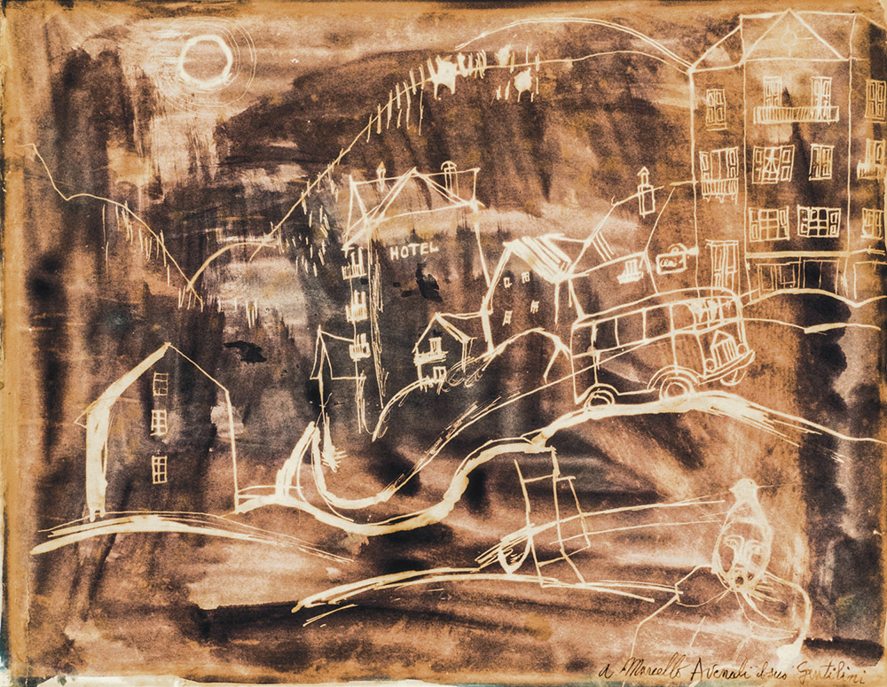 FRANCO GENTILINI Faenza 1909 - Roma 1981 Hotel Inchiostri acquarellati su carta applicata su cartoncino, 34 x 43,5 cm Firma e dedica in basso a destra: A Marcello Avenali il suo Gentilini FRANCO GENTILINI Faenza 1909 - Rome 1981 Hotel Ink and watercolour on paper laid down on cardboard, 34 x 43,5 cm Signed and inscribed lower right: A Marcello Avenali il suo Gentilini