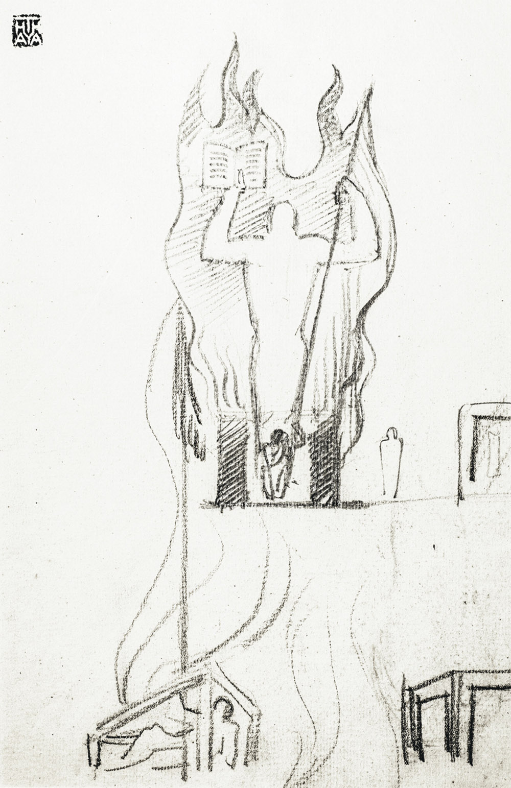 THAYAHT (Ernesto Michahelles) Firenze 1893 – Marina di Pietrasanta (LU) 1959 Studio per il Monumento al Prigioniero Politico, Anni ‘50 Pastello nero su carta, 36 x 23 cm Timbro THAYAHT in alto a sinistra THAYAHT (Ernesto Michahelles) Florence 1893 – Marina di Pietrasanta (LU) 1959 Symbols, 40’s Black pastel on paper, 36 x 23 cm Stamp THAYAHT upper left