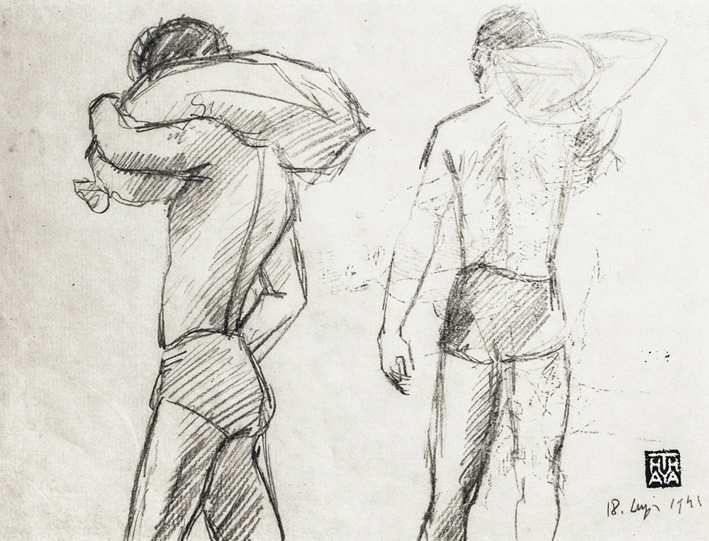 THAYAHT (Ernesto Michahelles) Firenze 1893 – Marina di Pietrasanta (LU) 1959 Facchini, 1941 Matira su carta, 22,5 x 29 cm Timbro THAYAHT e data in basso a destra: 18. Luglio 1941 THAYAHT (Ernesto Michahelles) Florence 1893 – Marina di Pietrasanta (LU) 1959 Labourers, 1941 Pencil on paper, 22,5 x 29 cm Stamp THAYAHT and dated lower right: 18. Luglio 1941