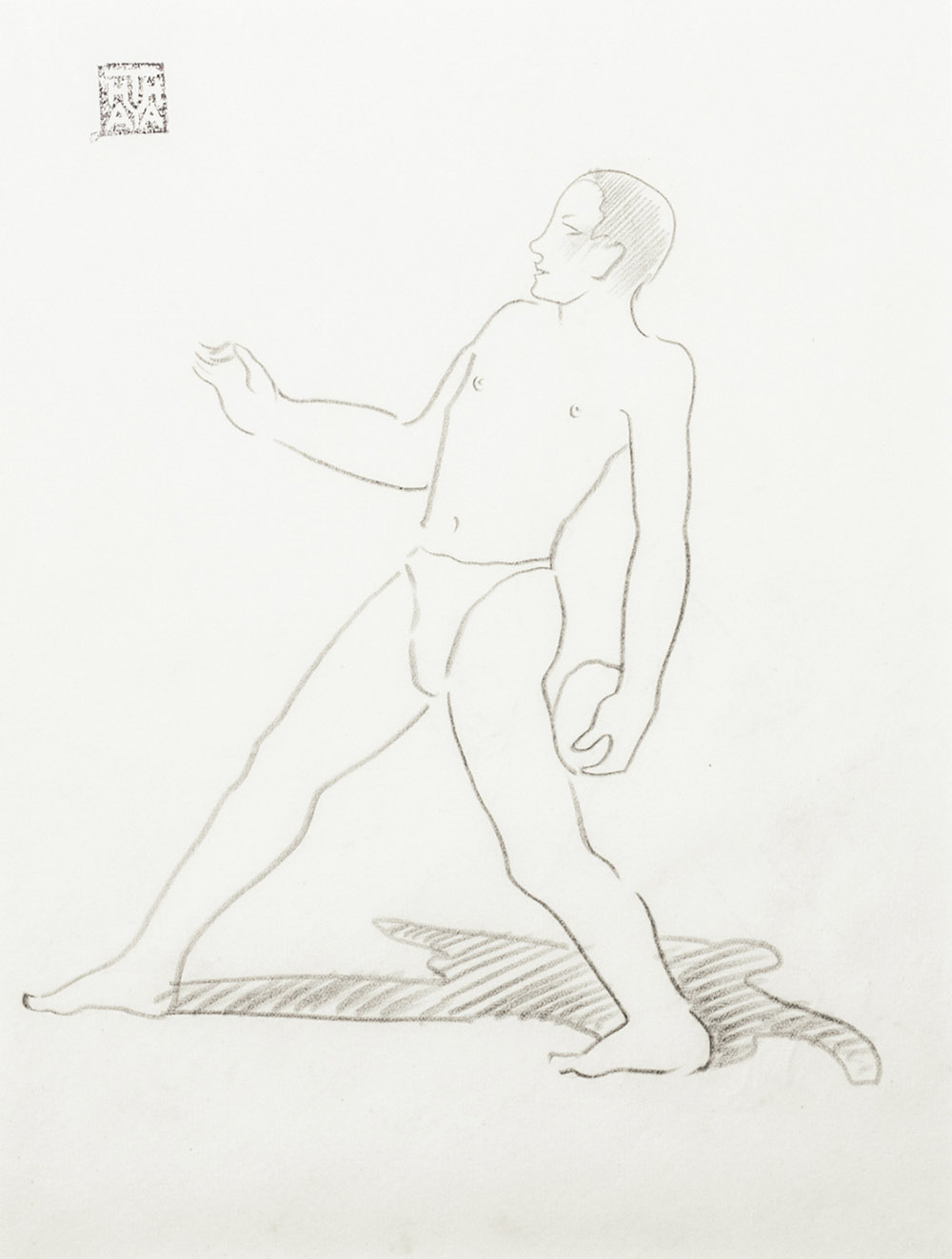 THAYAHT (Ernesto Michahelles) Firenze 1893 – Marina di Pietrasanta (LU) 1959 Atleta, Anni ‘30/’40 Pastello nero su carta, 30 x 24 cm Timbro THAYAHT in alto a sinistra THAYAHT (Ernesto Michahelles) Florence 1893 – Marina di Pietrasanta (LU) 1959 Athlete, 30’s/40’s Black pastel on paper, 30 x 24 cm Stamp THAYAHT upper left