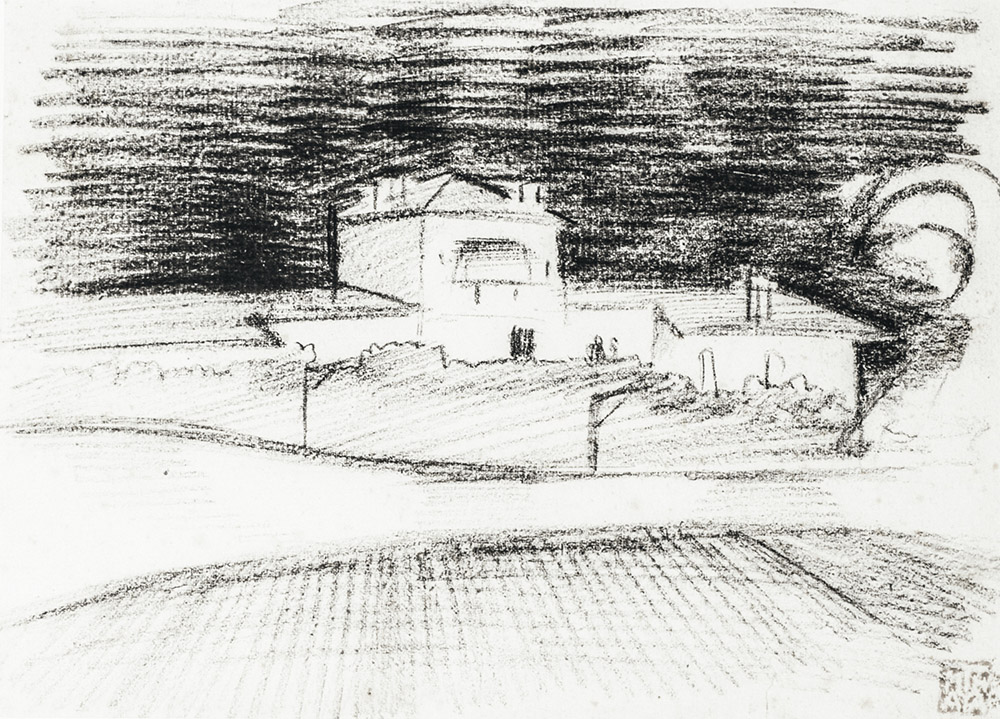 THAYAHT (Ernesto Michahelles) Firenze 1893 – Marina di Pietrasanta (LU) 1959 Casolari, Anni ‘30/‘40 Pastello nero su carta, 21,5 x 29 cm Timbro THAYAHT in basso a destra THAYAHT (Ernesto Michahelles) Florence 1893 – Marina di Pietrasanta (LU) 1959 Farmhouses, 30’s/40’s Black pastel on paper, 21,5 x 29 cm Stamp THAYAHT lower right