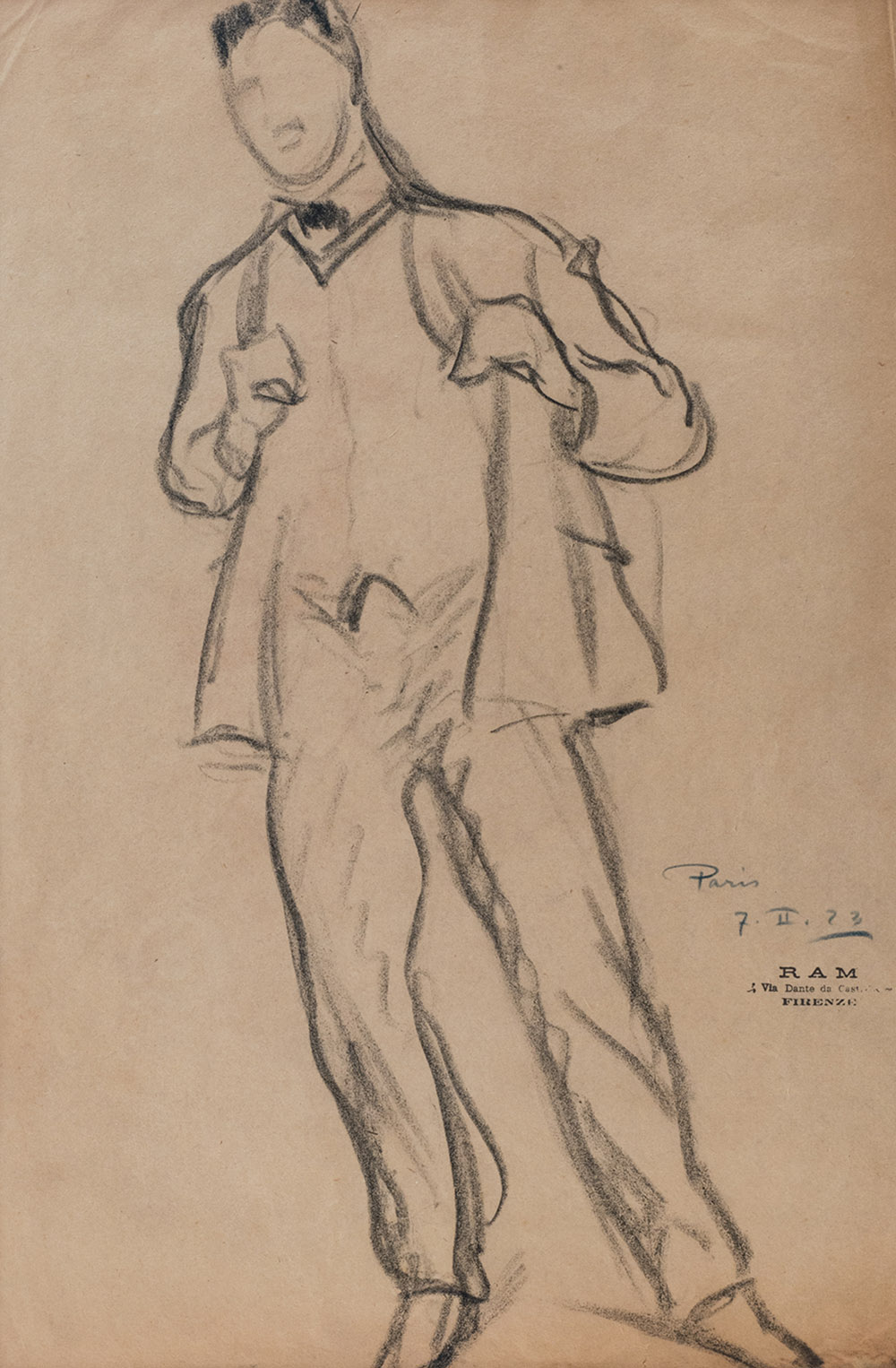 RAM (Ruggero Michahelles) Firenze 1898 – 1976 Figura maschile, 1923 Carboncino su carta, 43 x 29 cm circa Timbro RAM, luogo e data in basso a destra: Paris 7. II. 23 RAM (Ruggero Michahelles) Florence 1898 – 1976 Male figure, 1923 Black charcoal on paper, 43 x 29 cm Inscribed and dated lower right: Paris 7. II. 23 Stamp RAM lower right